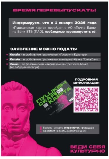 С 1 января 2026 года ВТБ становится банком-оператором государственной программы «Пушкинская карта». Поэтому владельцам Пушкинских карт следует подать заявление на перевыпуск в ВТБ до конца 2025 года. 1. Пушкинская карта, выпущенная АО «Почта Банк», будет действовать до 15:00 31 декабря 2025 года.