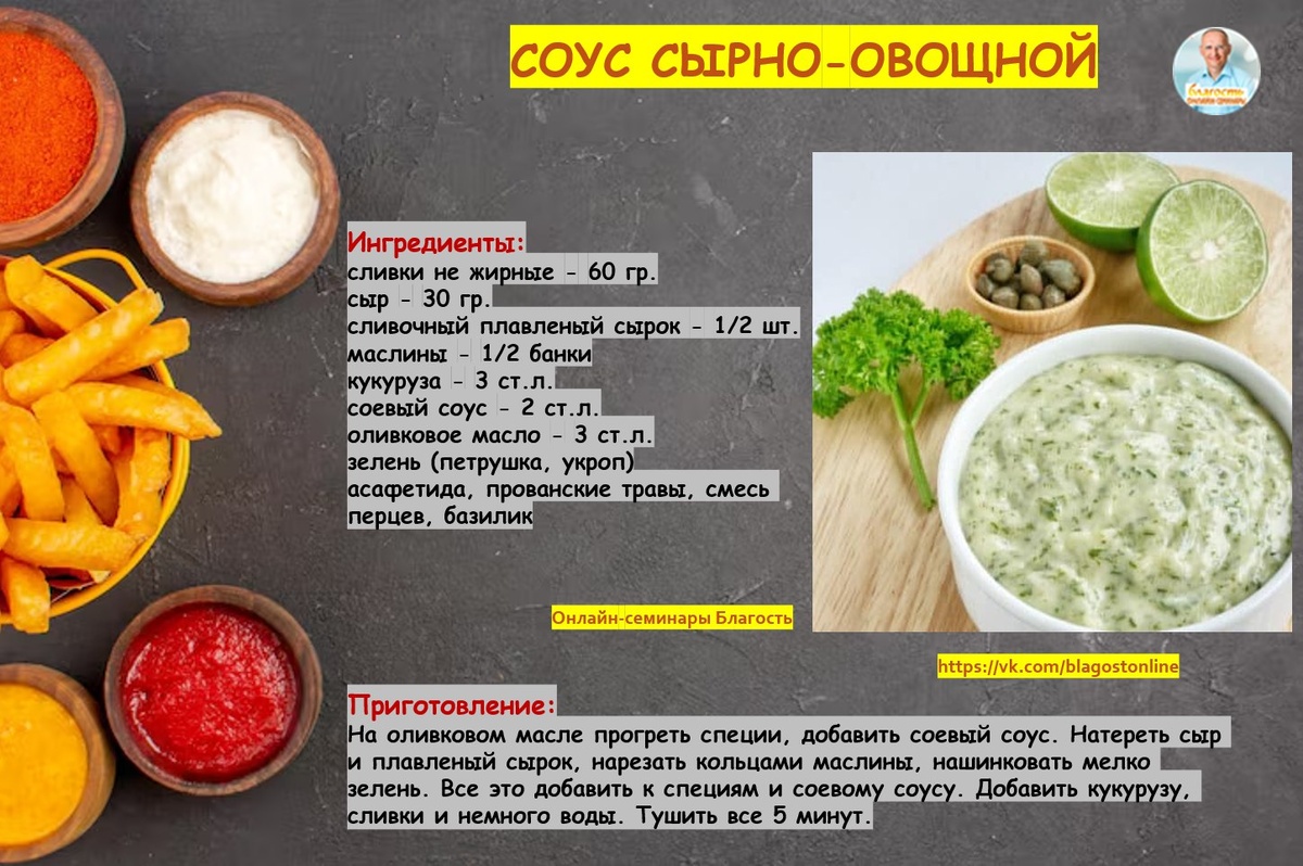 🍛 СОУС СЫРНО-ОВОЩНОЙ 🌀 Ингредиенты: сливки не жирные - 60 гр. сыр - 30 гр. сливочный плавленый сырок - 1/2 шт. маслины - 1/2 банки кукуруза - 3 ст.л. соевый соус - 2 ст.л. оливковое масло - 3 ст.л. зелень (петрушка, укроп) асафетида, прованские травы, смесь перцев, базилик 🌀 Приготовление: На оливковом масле прогреть специи, добавить соевый соус. Натереть сыр и плавленый сырок, нарезать кольцами маслины, нашинковать мелко зелень. Все это добавить к специям и соевому соусу. Добавить кукурузу, сливки и немного воды. Тушить все 5 минут.