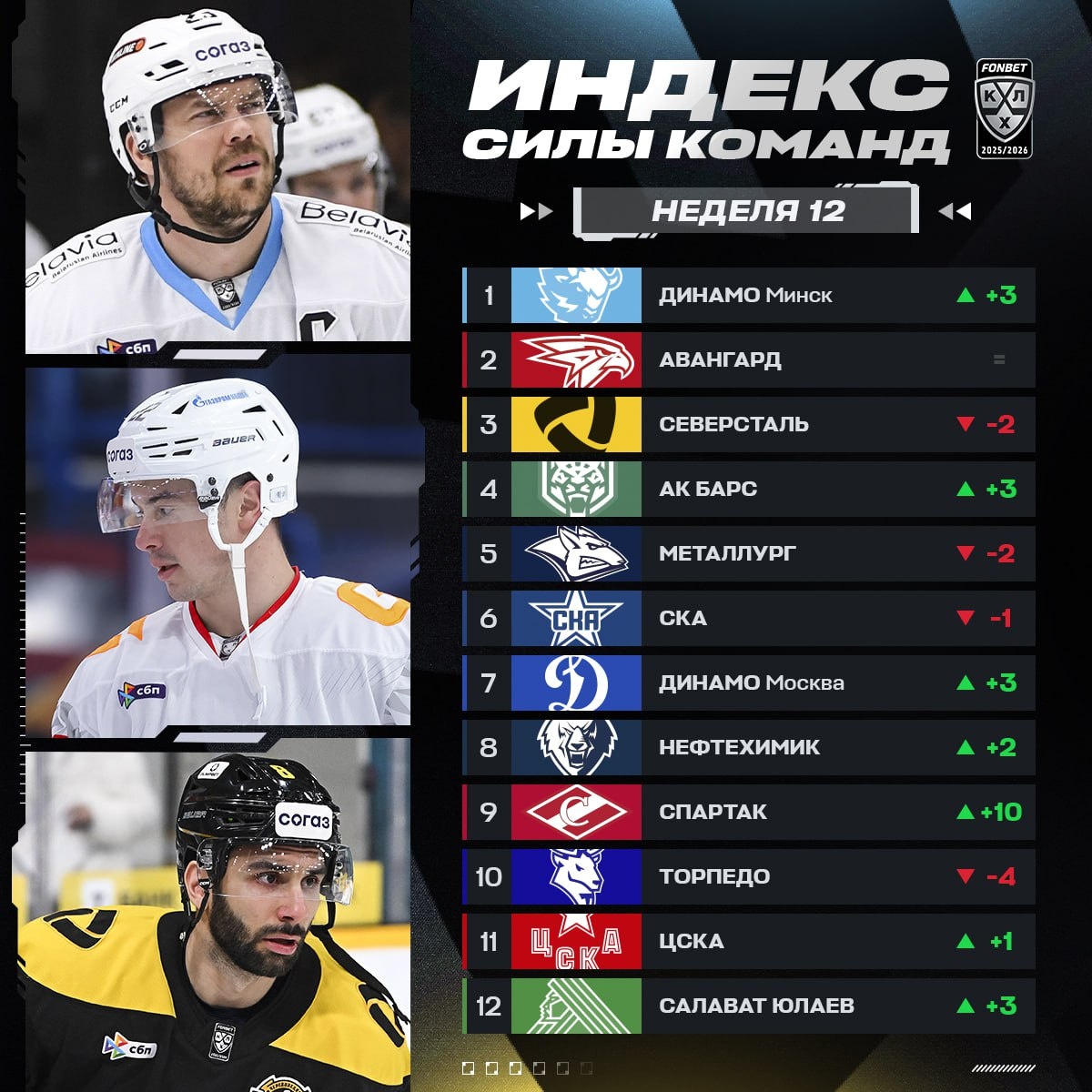 Минское «Динамо» снова возглавило Индекс силы команд. Индекс силы – это рейтинг, подсчитывающийся математически на основе показателей в текущем сезоне. Индекс силы показывает, какие команды в настоящий момент находятся «на ходу», обыгрывают фаворитов и выдают длительные победные серии (за победу в основное время одна команда отнимает у другой 25% её баллов, в случае победы в овертайме или по буллитам — 12.5%).