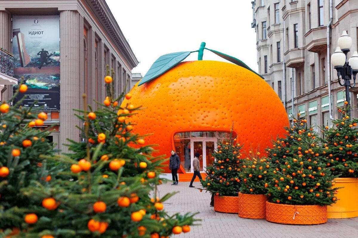 В столице ОГРОМНЫЙ мандарин приземлился на Арбате, а прозрачная коробка с коньками украшает Кузнецкий мост.