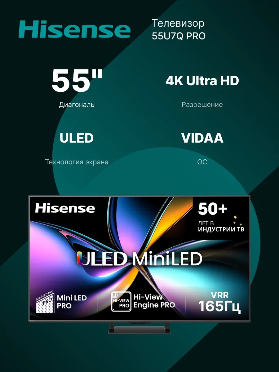 ✅ Для всех, кто ищет "топовые" характеристики по средней цене. На рынке в своем ценовом сегменте HISENSE 55U7Q PRO не имеет прямых аналогов с частотой 165 Гц. За те же деньги конкуренты (Samsung, LG, S