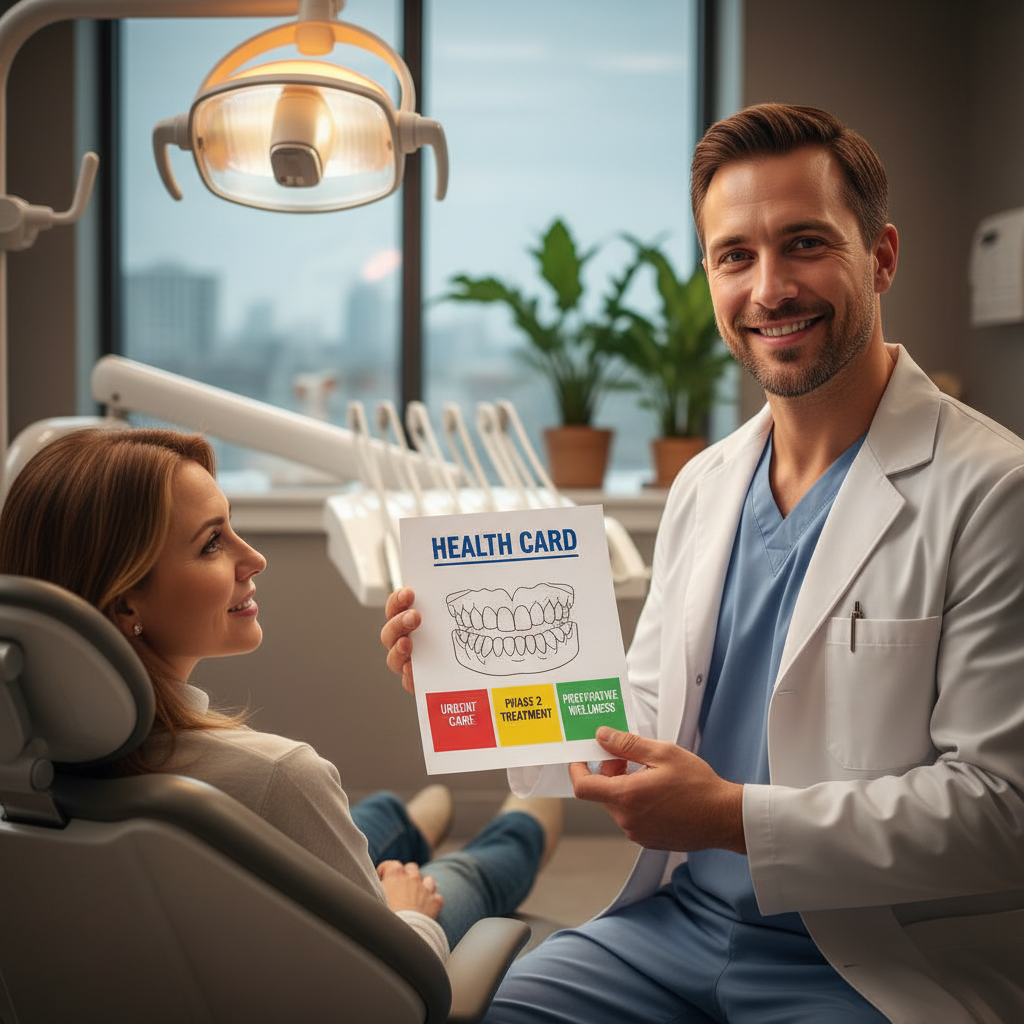 «Я подготовил для Вас карту здоровья полости рта. Это не детальный план лечения, а общая картина того, что происходит у Вас во рту и что нужно сделать в первую очередь. Вот здесь (показываете) описано текущее состояние. Вот здесь — что критично и требует внимания в ближайшее время. А вот это можно запланировать на потом. Заберите карту домой, обдумайте, обсудите с близкими. Когда будете готовы начать лечение, приходите, и мы составим подробный план с расчётом стоимости и сроков».