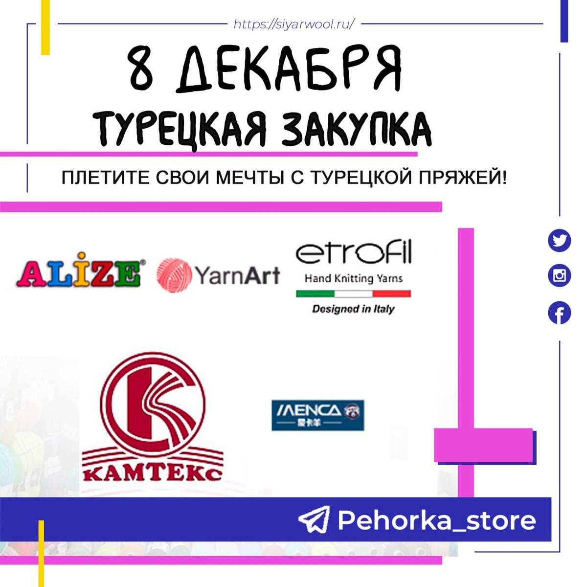 Закупка состоится 8 декабря Цены 👇 (нужно зайти в чат, чтобы просматривать цены) https://t.me/+NjN2voU9AGsyM2Uy Выбрать пряжу можно 👇 https://siyarwool.ru/catalog/ Заказы Пишем только в личные (чтобы не давать мошенникам повод) и оплачиваем только на имя❗️Светлана Владимировна П. тел. 8-9O9--159-99--92 (Т-Банк) Так же можно написать напрямую через VK https://vk.com/pehorka_store или https://vk.com/kidwool можно написать заказ в Ватцап (по номеру 8-909-159-99-92) Закупка от 1 упаковки любой пряжи 🧶 🚙 Доставка 📦Дешевле всего обходится АВИТО доставка, независимо от веса. 📦 Почтой России 📦 Яндекс Доставка И не верьте мошенникам, которые предлагают Вам другие способы доставки. (они очень любят СДЭК обещать) По всем вопросам (не бывает не удобных вопросов) пишите так же мне @Kidwool либо по кнопочке ниже 👇 P.S. менеджеров, помощников и других лиц, принимающих заказы и оплаты у меня нет!!! 🌺🌺🌺 #вязаныеноски #авоська #пряжа #купитьпряжу Канал со схемами