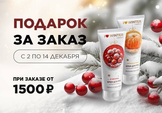 🔸🔸🔸🔸🔸🔸🔸 Крем для рук в подарок за заказ! ❄️❄️❄️ С 2 по 14 декабря некоторые покупатели вашей структуры, которые сделают заказ от 1500 руб. (в ценах каталога) получат в подарок (за 1 руб.) крем для рук на выбор: 🩶Крем для рук «Бережная защита» I LOVE WINTER, арт. 12105; 🩶Крем для рук «Интенсивное питание» I LOVE WINTER, арт. 12106; 🩶Питательный крем для рук «Малиновый мильфей» Beauty Cafe, арт. 1918; 🩶Витаминный крем для рук «Арбуз и дыня» Vitamania, арт. 12011; 🩶Витаминный крем для рук «Манго и папайя» Vitamania, арт. 12012; 🩶Питательный крем для рук «Клубничный макарун» Beauty Cafe, арт. 2976; 🩶 Крем для рук «Моккачино» Beauty Cafe, арт. 12139. ❤️ Счастливчики получат уведомление по e-mail. ✔️ Подарок доступен при оформлении заказа в разделе «Персональные акции – Подарок за заказ». ‼️ Покупатель может получить только один подарок за указанный период. 💛 Участники акции отмечены желтым цветом и буквой «А» в отчете «Информация по личной группе».