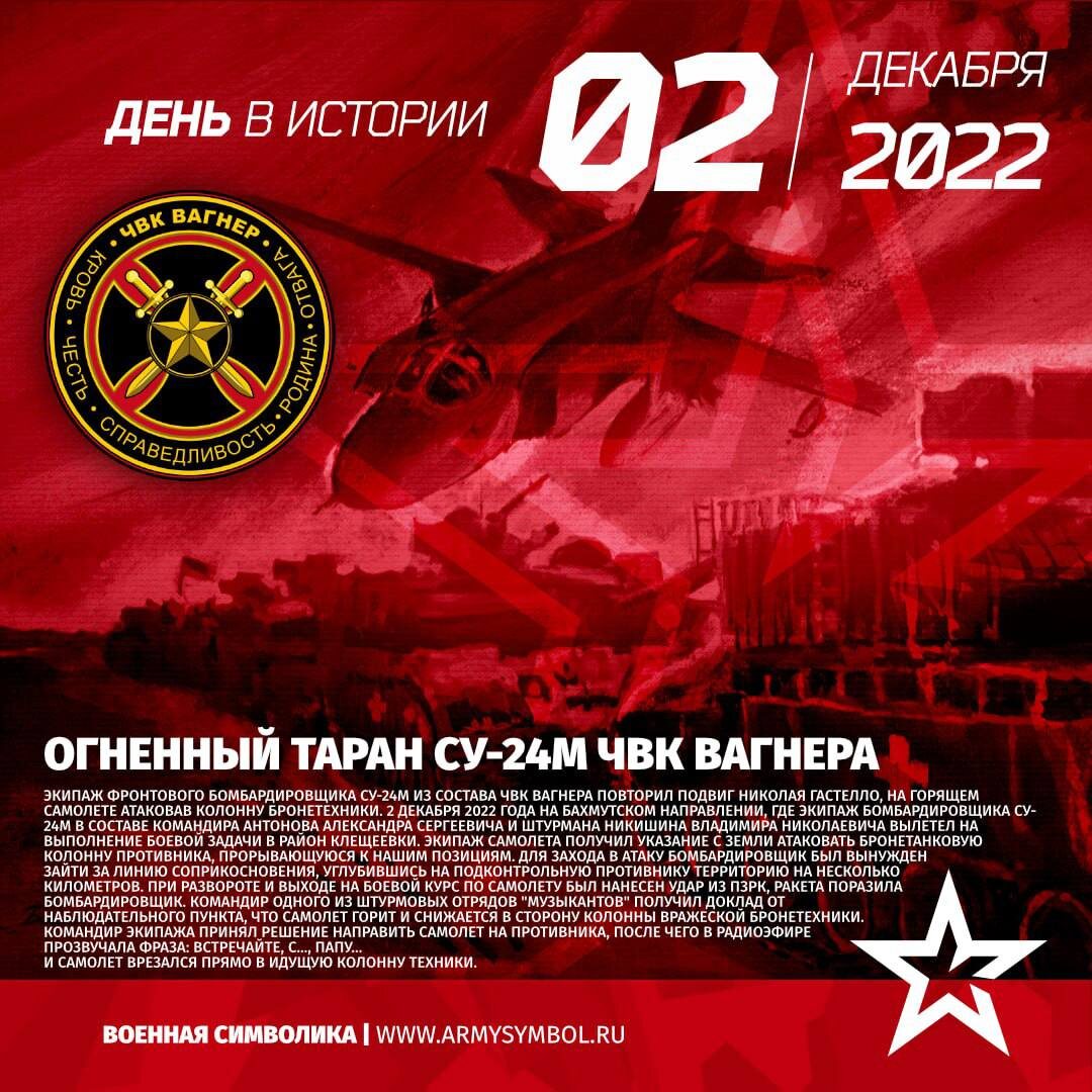 «Встречайте, суки Папу!» 2 декабря 2022 года экипаж фронтового бомбардировщика Су-24М из состава ЧВК Вагнера повторил подвиг Николая Гастелло, на горящем самолете атаковав колонну бронетехники. На Бахмутском направлении экипаж бомбардировщика Су-24М в составе командира Антонова Александра Сергеевича и штурмана Никишина Владимира Николаевича вылетел на выполнение боевой задачи в район Клещеевки. В это время противник предпринял попытку прорыва с использованием бронетехники, вследствие чего возникла серьезная угроза потери «музыкантами» позиций, отбитых у ВСУ. Экипаж самолета получил указание с земли атаковать бронетанковую колонну противника, прорывающуюся к нашим позициям. Для захода в атаку бомбардировщик был вынужден зайти за линию соприкосновения, углубившись на подконтрольную противнику территорию на несколько километров. При развороте и выходе на боевой курс по самолету был нанесен удар из ПЗРК, ракета поразила бомбардировщик. Командир одного из штурмовых отрядов «музыкантов» п