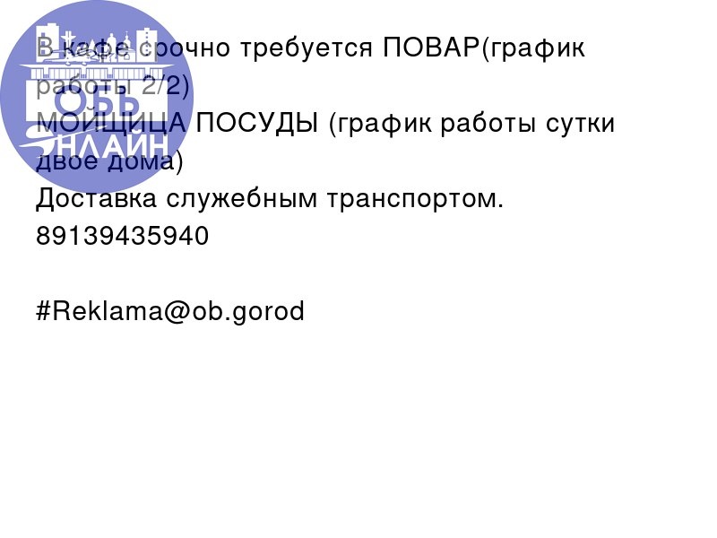 ↗ В кафе срочно требуется ПОВАР(график работы 2/2) МОЙЩИЦА ПОСУДЫ (график работы сутки двое дома) Доставка служебным транспортом. 89139435940 #Reklama@ob.gorod vk.ru Подробнее на https://vk.com/ob.gorod #городобь #городобьонлайн #толмачево
