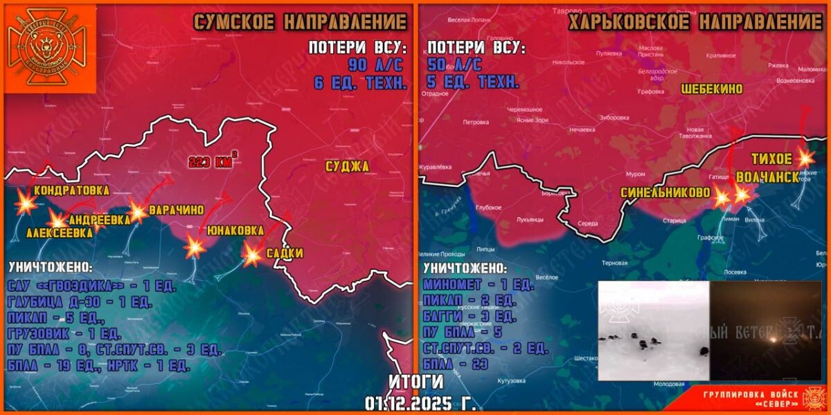 К утру 2 декабря появились новые подробности формирования полосы безопасности в Харьковской и Сумской областях Украины, в том числе на подступах к госгранице с Курской областью Украины. Штурмовики Северян пробиваются вглубь Сумской области с тяжелыми боями. Противник ожесточенно отбивается, отсиживаясь в глухой обороне. Так, в результате авиаудара ликвидирована очередная группа наемников ВСУ. Есть уничтоженных иностранцев были чехи и поляки. На Теткинском и Глушковском направлениях кардинальных перемен не зафиксировано. Артиллерия Северян сносила скопления живой силы и техники ВСУ в районе Рыжевки.