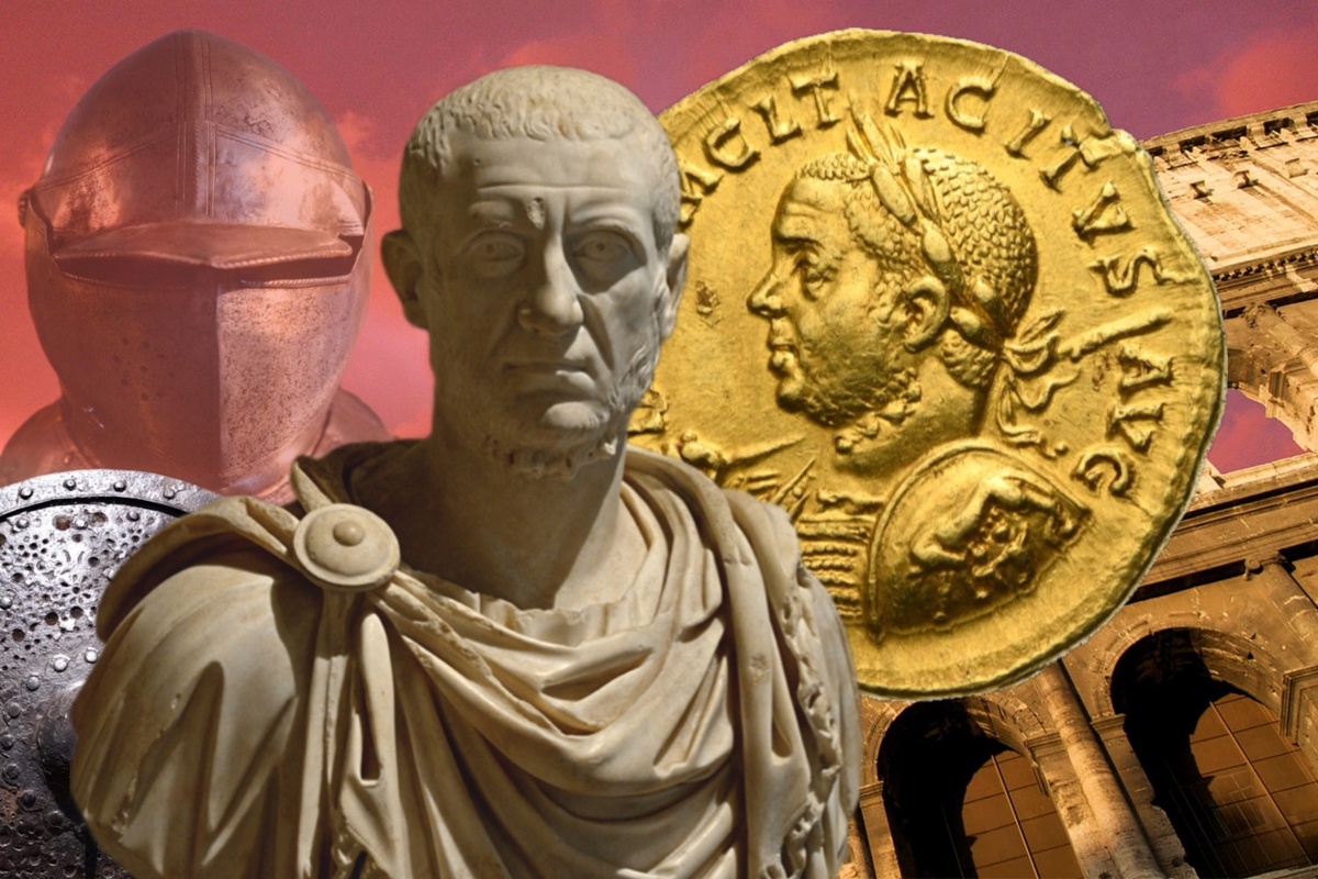 На античных монетах периода поздней римской империи одним из самых распространенных был образ правителя-воина. Так на аверсе ауреуса 275-276 годов можно увидеть императора Тацита, который предстает в военных доспехах. В левой руке правитель держит овальный щит клипеус. Такие щиты изготавливались из склеенных вместе вертикальных планок, обтянутых с внешней и внутренней стороны крашеной кожей. Окружность кромки щита затянута сыромятью: высыхая, она туго стягивала планки, и обеспечивала надежное соединение. Использование сыромятной кожи уменьшало вес щита по сравнению с употребляемыми ранее для оковки кромок сплавами на основе меди. В правой руке императора копье. Тацит (275 – 276 гг.). Ауреус В римской армии использовались копья различных типов. Кроме того, этот вид оружия часто выполнял символическую функцию. Так копье-гасту бросали на вражескую территорию для объявления войны. Особая гаста без наконечника в раннюю эпоху была римской боевой наградой, присуждавшейся также после завер