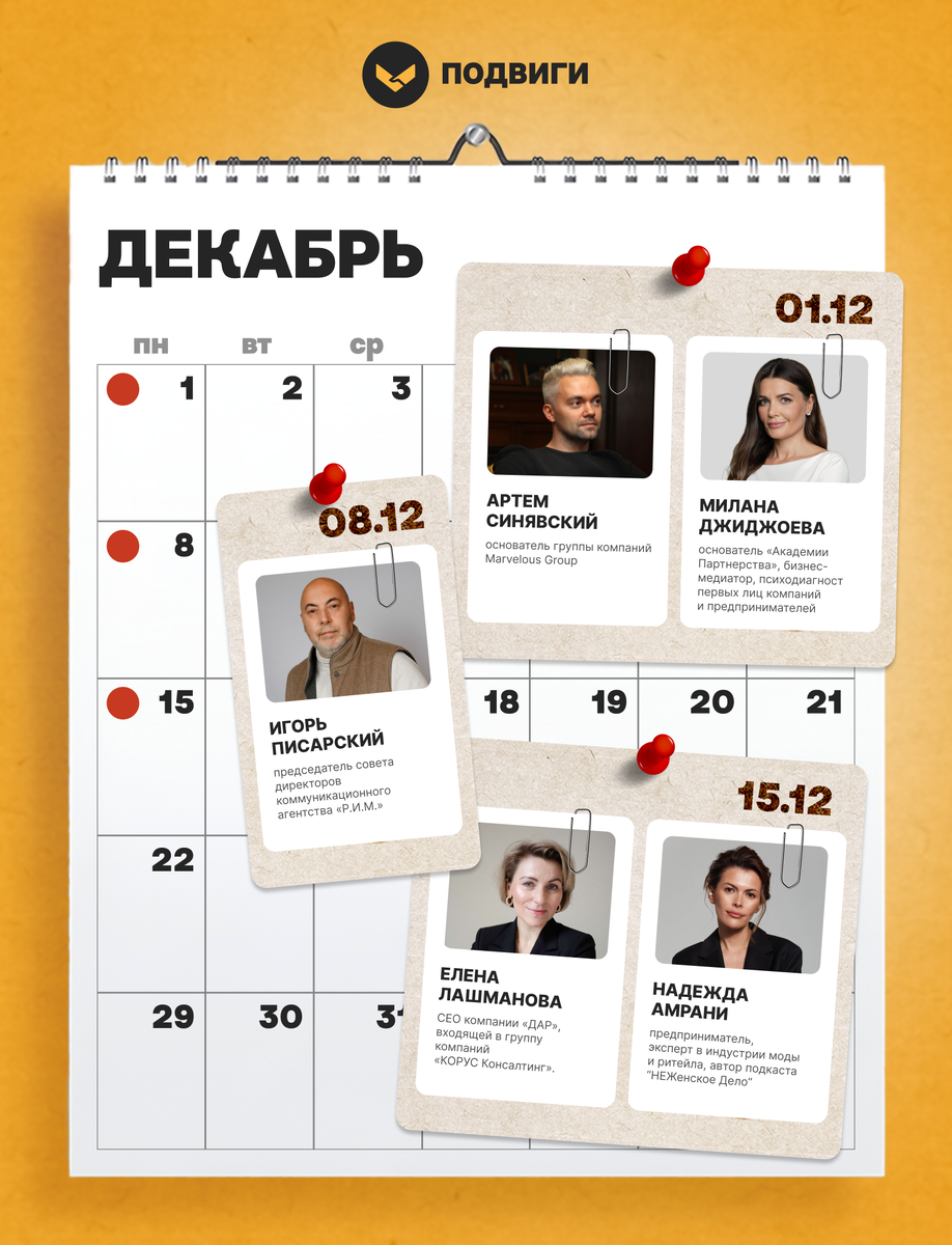 Привет, дорогие! Делимся с вами расписанием декабрьских благотворительных аукционов с нашими героями на платформе Meet For Charity ❄️ ✅ 1 декабря Артем Синявский – основатель группы компаний Marvelous Group. Это шесть рекламных агентств, маркетплейс современного искусства Bizar и несколько технологических стартапов. Милана Джиджоева – сооснователь Клуба медиации и партнёрства в Alumni БШ «Сколково», основатель консалтинговой компании «СОТЕР», автор комплексной методики по диагностике партнёрств и научных работ по проблематике лидерского одиночества. ✅ 8 декабря Игорь Писарский – идеолог пиара и рекламы в России. Председатель совета директоров коммуникационного агентства «Р.И.М.». Руководил более чем 700 коммуникационными кампаниями федерального уровня в сфере PR, рекламы и управленческого консалтинга. Профессор, автор книг, лектор. Председатель попечительского совета премии «Серебряный Лучник». ✅ 15 декабря Елена Лашманова – СЕО компании «ДАР», входящей в группу компаний «КОРУС Консалт