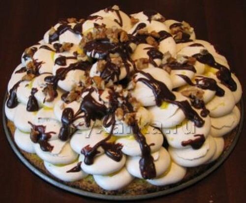 Закройте выложенную массу слоями безе, не забывая смазывать их заварным кремом. Украсьте верх торта шоколадом и орехами.