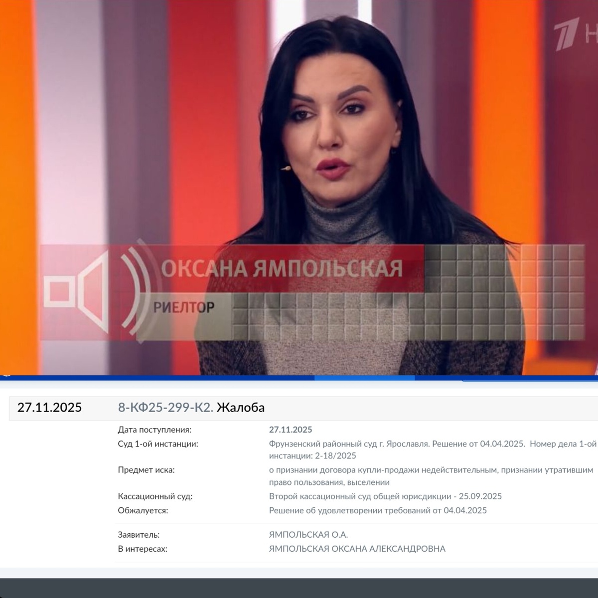 📎Карточка дела(жалобы) в Верховном суде 👉Ссылка на решение суда первой инстанции Фото с передачи "Пусть говорят". Где героиня рассказывала о планах обращения в Верховный суд РФ Почитайте решение, покупатель просил уточнить порядок реституции и возврата средств, но суд решил,что это вопрос на стадии исполнения решения суда. А как же процессуальная экономия? Буду следить за движением дела, подпишись, чтобы не пропустить Резолютивная часть обжалуемого решения: Исковые требования Поповой И.Л. к Ямпольской О.А., Переломову И.Д., Петровой Е.А. о признании сделки недействительной, признании утратившими право пользования, снятии с регистрационного учета, выселении удовлетворить. Признать недействительным договор купли-продажи, заключенный между Поповой И.Л. и Ямпольской О.А., применив последствия недействительности сделки. Взыскать с Поповой И.Л. в пользу Ямпольской О.А. денежные средства в размере 3 000 000 руб. Данное решение является основ