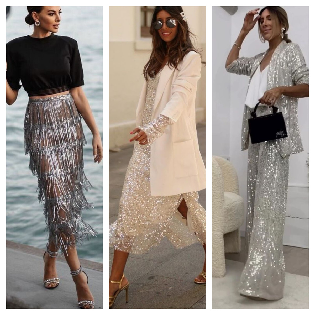 Предлагаем рассмотреть пять праздничных нарядов, идеально подходящих для корпоративной вечеринки. Все предложенные варианты отличаются элегантностью, женственностью и соответствием актуальным модным тенденциям. Многие из них окажутся полезными и в обычной жизни, легко интегрируясь в повседневные комплекты. Пайетки, стразы и кристаллы Платья, расшитые пайетками, элегантные юбки миди или топы, украшенные стразами, помогут создать торжественный и праздничный образ. Уровень официальности мероприятия регулируется добавлением нейтральных предметов гардероба, подчеркивающих центральную блестящую деталь. Практичность на протяжении года: праздничные вещи легко вписываются в повседневный стиль спорт-шик. Попробуйте сочетать сверкающий элемент с грубыми материалами, такими как спортивные худи, олимпийки, теплые свитеры крупной вязки и военные ботинки, играя на контрасте текстур и стилей. Подборка праздничных вещей: ✔️Бежевые брюки в пайетках за 1800₽ ✔️Юбка за 3400₽ ✔️Серая юбка за 3000₽ ✔️