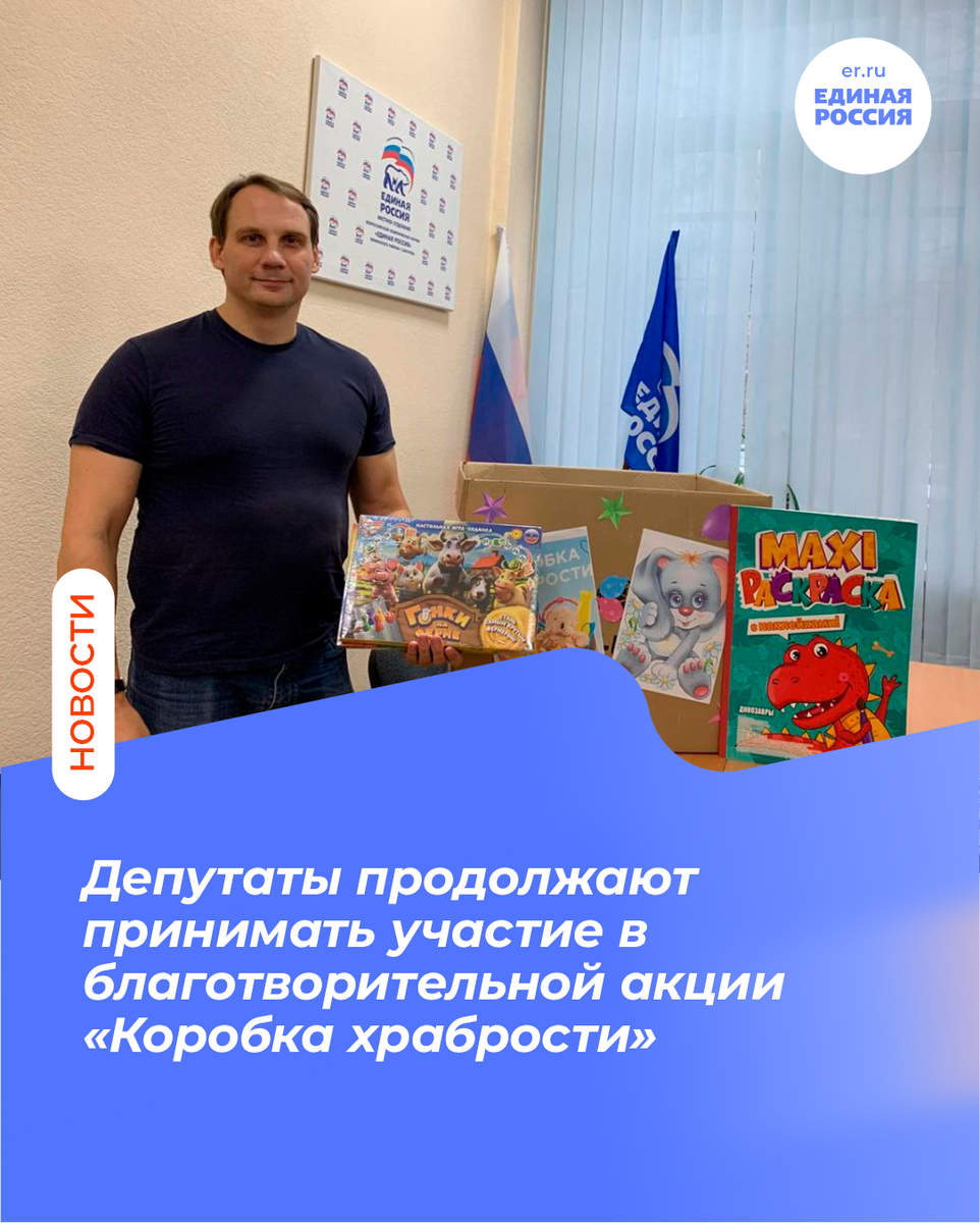 В 13-й раз партия «Единая Россия» запустила благотворительную акцию «Коробка храбрости». По всей стране активисты и сторонники партии собирают для детей, находящихся на длительном лечении и реабилитации в больницах, подарки. Маленькие пациенты получат игрушки, книги, канцтовары и наборы для творчества.