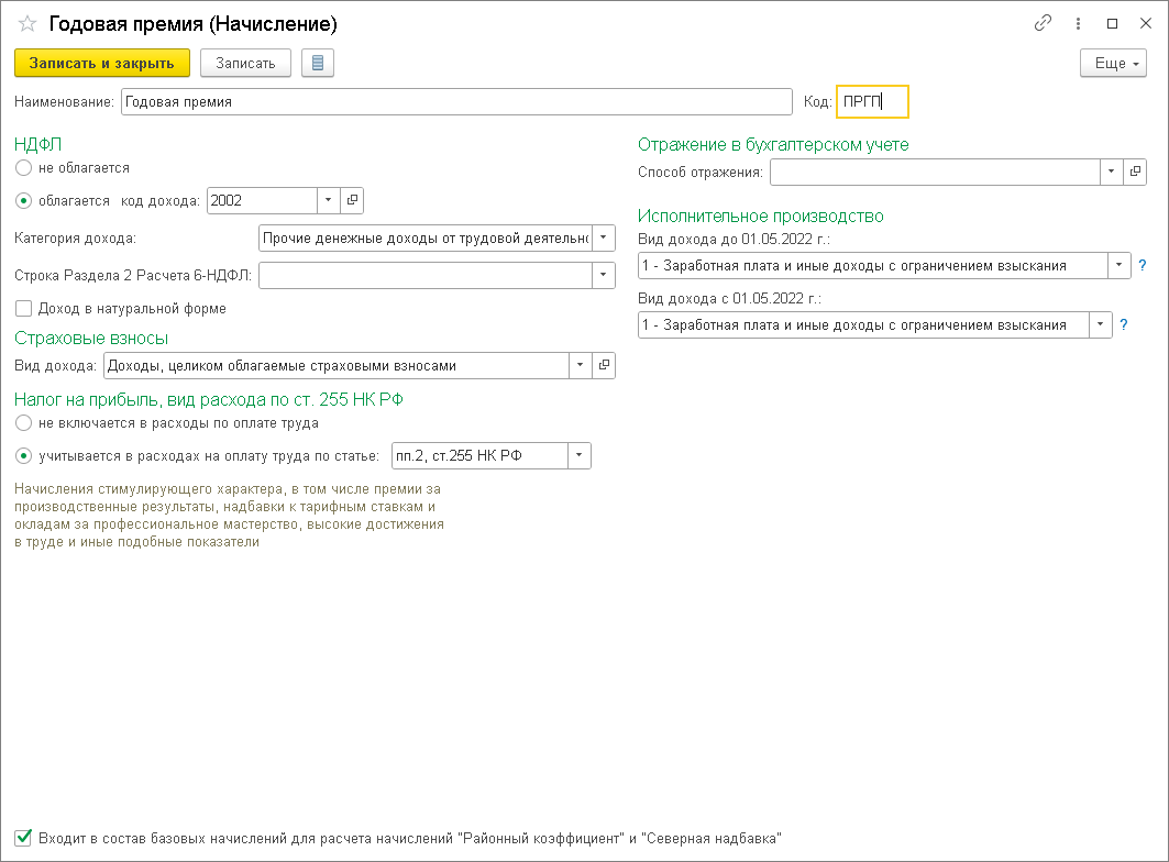- Флажок Входит в состав базовых начислений для расчета начислений "Районный коэффициент" и "Северная надбавка" устанавливается по умолчанию. При необходимости данный флажок может быть снят. В нашем примере флажок снимать не нужно, т. к. в районах и местностях, в которых в установленном порядке применяются районные коэффициенты к заработной плате, данная премия определяется с учетом этих коэффициентов.