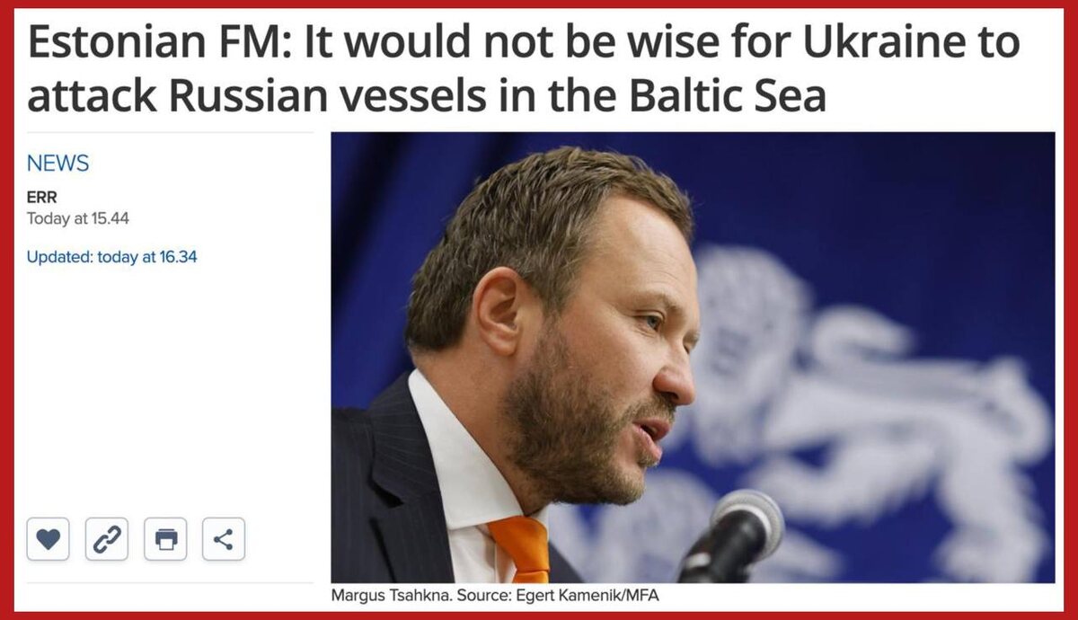 Эстония призвала Зеленского не бить по российским судам в Балтийском море после ударов по нефтяным танкерам у берегов Турции, передает ERR. Глава МИД Маргус Цахкна заявил, что это "было бы неразумно" и может привести к эскалации в регионе. «Более 60% российского экспорта газа и нефти проходит через Финский залив, и это огромный объем, особенно в коридоре шириной всего около шести морских миль. Было бы разумно это не делать, потому что это действительно может привести к эскалации ситуации в Балтийском море», — заявил Цахна. При этом он сказал, что бандеровский режим имеет право уничтожать цели на территории России, но "международные воды — это немного другой вопрос". По его мнению, Европа может осудить фашистов за такие удары, но это может не остановить наркомана, если он посчитает, что это не приведёт к полной остановке европейской поддержки. Подпишись на Телеграм Александр Семченко