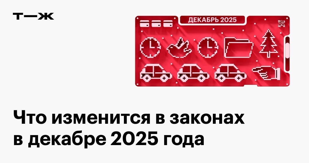 🔴Повысили утильсбор на автомобили. 🔴В банках вместо паспорта можно будет предъявлять QR-код с госуслуг. 🔴Заканчивается срок автоматического продления водительских прав. 🔴Иностранцы будут сдавать биометрию во всех пунктах пропуска через границу РФ. Рассказываем про эти и другие изменения в законах в декабре: https://t-j.ru/tg/new-zakon-12-25/