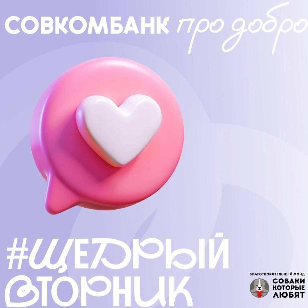 В этот день Совкомбанк увеличит все пожертвования в 5 раз в рамках глобальной акции #ЩедрыйВторник! Принять участие в акции могут не только клиенты банка. Вы можете поддержать наш фонд «Собаки, которые любят»: 1. Отправьте пожертвование: - зарегистрируйтесь на платформе (https://prodobro.ru/ ) и получите 500 добробаллов (или авторизуйтесь, если вы уже пользователь). Добробаллы начисляются за регистрацию на платформе, в виде «кэшбека» за пожертвования; - выберите наш сбор - https://prodobro.ru/projects/pomojem-tshenkam-i-kotyatam-sohranit-zdorove ; - введите сумму в рублях, а Совкомбанк умножит эту сумму в 5 раз! 2. Проголосуйте за наш фонд: - перейдите на сайт - https://prodobro.ru/voting ; - авторизуйтесь или зарегистрируйтесь по номеру телефона; - найдите наш фонд «Собаки, которые любят» и нажмите «Голосовать»; - укажите, сколько добробаллов хотите отдать; - чем больше добробаллов, тем выше наши шансы одержать победу и выиграть 1 млн рублей! Даже небольшое пожертвование в этот день
