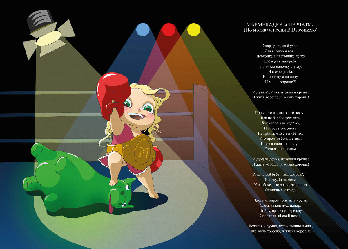 Удар, удар, ещё удар, Опять удар и вот – Девчонка в платьишке легко Проводит апперкот! Прижала папочку в углу И я едва ушёл. Но почему я на полу И мне нехорошо?! И думала дочка, игрушки круша: И жить хорошо, и жизнь хороша! При счёте «семь» я всё лежу – Я ж не балбес вставать! Хук слева я не удержу И справа хук опять. Неправда, что сильнее тот, Кто прожил больше зим. И вот я снова на полу – Отчасти невредим. И думала дочка, игрушки круша: И жить хорошо, и жизнь хороша! А дочь всё бьёт – вот здоровА! – Я вижу, быть беде, Хоть бокс – не драка, это спорт Отважных и тэдэ. Здесь компромиссы не в чести, Здесь важен дух, напор. Пойду, прилягу, пережду Спортивный свой позор. Лежал я и думал, чуть слышно дыша, что жить хорошо, и жизнь хороша!