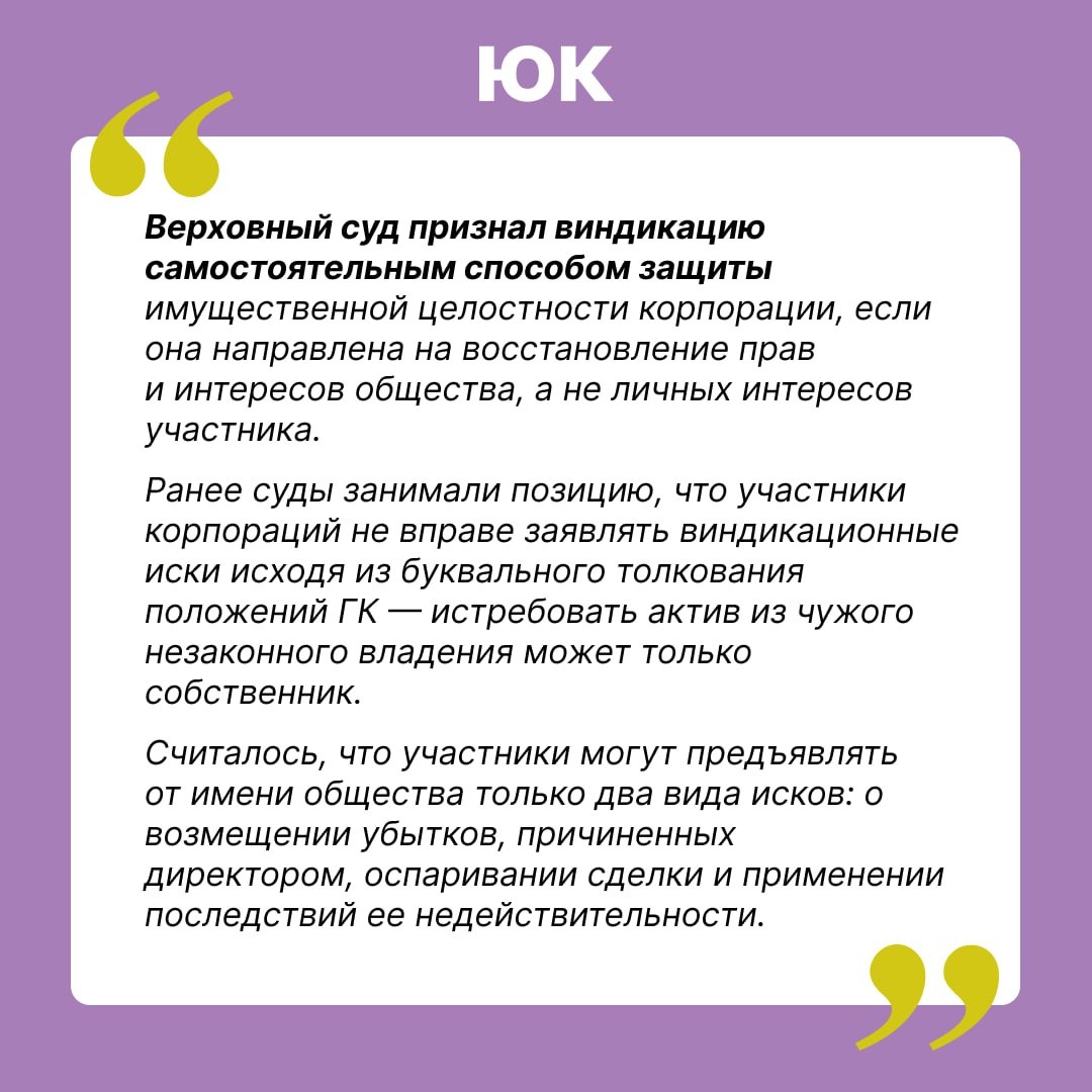 Позиции ВС и КС, которые помогут настроить корпоративную работу компании в 2026 году ➡️ Верховный суд расширил возможности участников по защите интересов корпорации. Теперь они могут предъявить виндикационный иск в интересах общества. Предъявить такой иск можно, даже если имущество перешло к третьему лицу и вернуть его в рамках реституции уже невозможно. Виндикацию можно заявить двумя способами: ⚪Первый способ — в дополнение к оспариванию сделки. ⚪Второй способ — вместо реституции, когда контрагент больше не владеет имуществом. Такие выводы ВС сделал, рассматривая спор об оспаривании договоров займа и соглашения об отступном, по которым из общества были выведены активы. Акционер потребовал истребовать недвижимость у последующих покупателей, полагая, что сделки были совершены в ущерб интересам компании (Определение ВС от 14.02.2025 по делу № А24-5930/2020). ↖️ Дмитрий Мальбин, партнер VERBA Legal, адвокат, к. ю. н., в статье журнала «Юрист компании» подробно разобрал, что учесть