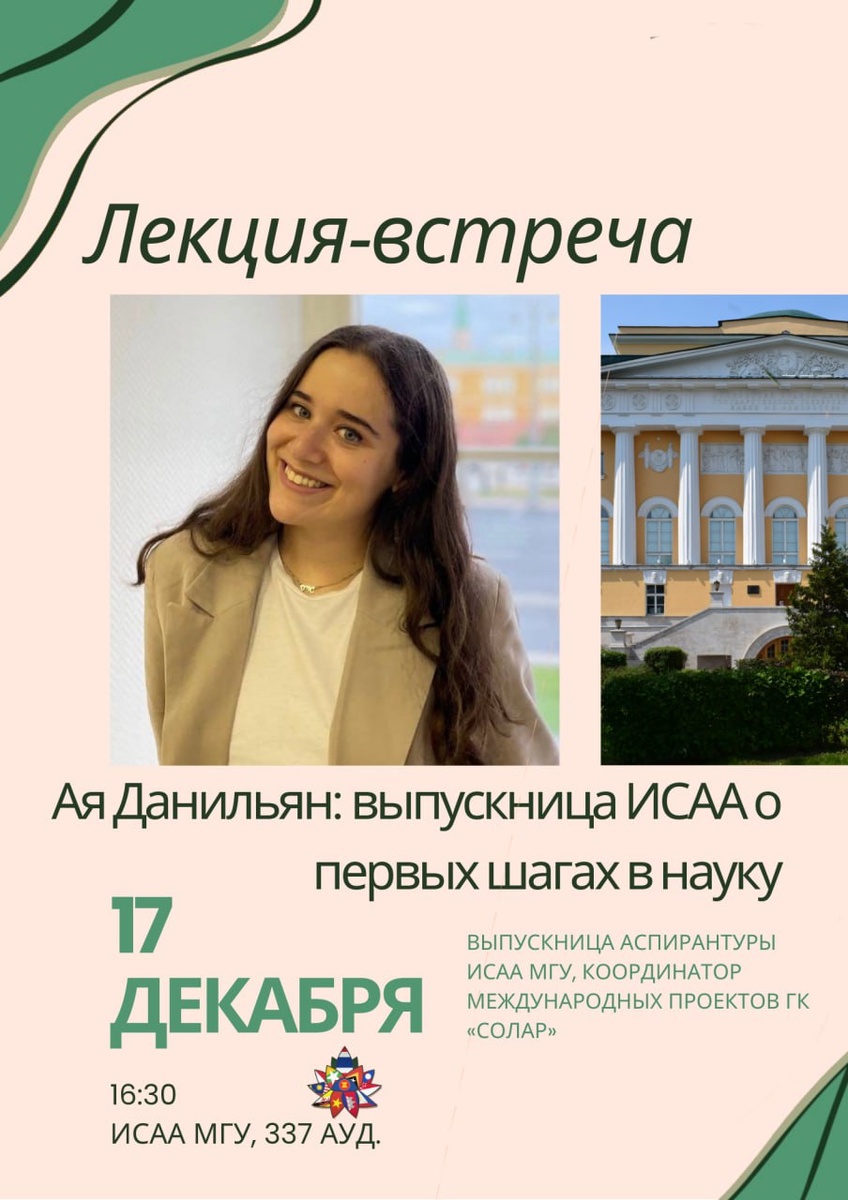 «Ая Данильян: выпускница ИСАА о первых шагах в науку» Как сделать первые шаги в научной деятельности, написать качественные тезисы и уверенно заявить о себе на конференциях? Приглашаем вас обсудить это на встрече с Аей Данильян — выпускницей магистратуры ИСАА МГУ и координатором международных проектов ГК «Солар», успешно совмещающей работу в сфере международных отношений с научной карьерой. В рамках цикла «Выпускники ИСАА — студентам» Ая расскажет: 🔹 С чего начать участие в научных конференциях и как выбрать подходящую тематику. 🔹 Как работать с президентским грантом и какие возможности он открывает студентам. 🔹 Как писать тезисы, готовить проект и представлять результаты исследования. 🔹 Чем помогает научная деятельность в ИСАА при старте карьеры в международных отношениях. 🔹 Личный опыт: как совмещать работу над исследованиями с профессиональными задачами в международных проектах. Регистрация: https://forms.yandex.ru/cloud/692e8c531f1eb59995ef1a99 Где 🗺: аудитория 337 ИСАА