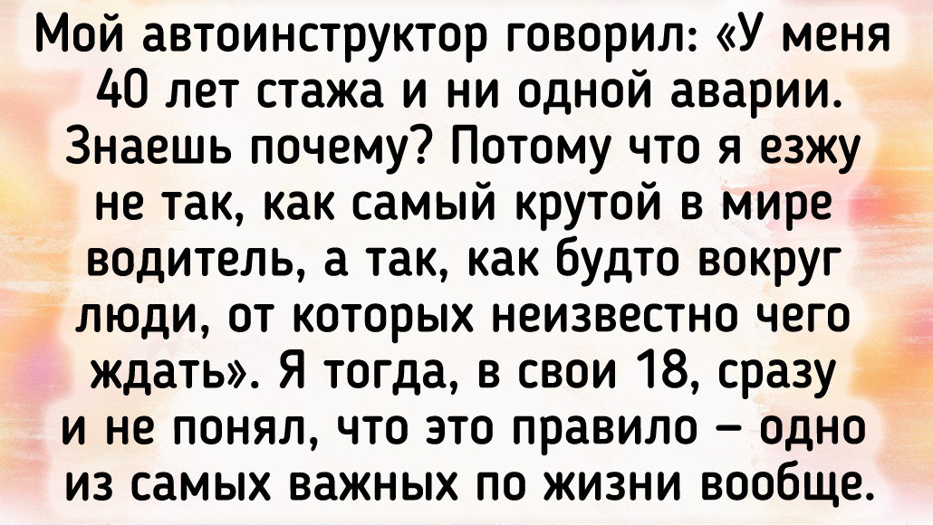 Мой автоинструктор говорил: «У меня 40 лет стажа и ни одной аварии. Знаешь почему? Потому что я езжу не так, как самый крутой в мире водитель, а так, как будто вокруг люди, от которых неизвестно чего ждать». Я тогда, в свои 18, сразу и не понял, что это правило — одно из самых важных по жизни вообще. © picolascagetyt / Twitter