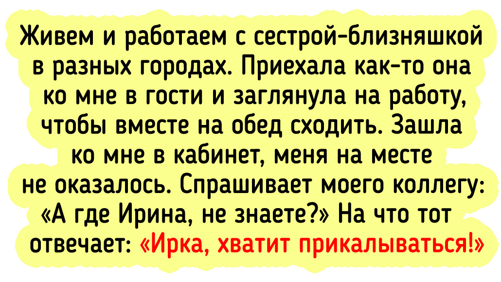 - Живем и работаем с сестрой-близняшкой в разных городах. Приехала как-то она ко мне в гости и заглянула на работу, чтобы вместе на обед сходить. Зашла ко мне в кабинет, меня на месте не оказалось. Спрашивает моего коллегу: «А где Ирина, не знаете?» На что тот отвечает: «Ирка, хватит прикалываться!» © Ирина Сидельникова