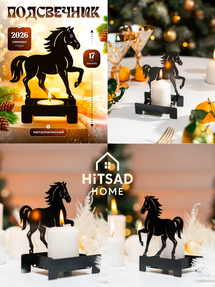 Подсвечник «Лошадь» — главный праздничный символ 2026 года в вашем доме Новый год всегда приносит с собой особое настроение — ожидание перемен, тепла, красивых традиций и маленьких ритуалов. 2026-й пройдёт под знаком Огненной Лошади, и именно поэтому фигурные аксессуары в образе Лошади становятся одним из главных трендов зимнего декора. Подсвечник «Лошадь» от HiTSAD HOME — это не просто сувенир, а стильный и тёплый элемент интерьера, который создаёт атмосферу уюта и привлекает символическую энергию наступающего года. Почему Лошадь — идеальный символ для вашего дома в 2026 году По восточному календарю Лошадь приносит энергию движения, удачи, вдохновения и уверенности. Такой символ в интерьере работает как маленький талисман: помогает настроиться на перемены, заряжает пространство динамикой, становится красивым акцентом праздничного декора. Фигура Лошади на фоне живого огня создаёт особый эффект: свет свечи подчёркивает силуэт, добавляя образу мягкое сияние и глубину. Стиль и эстети