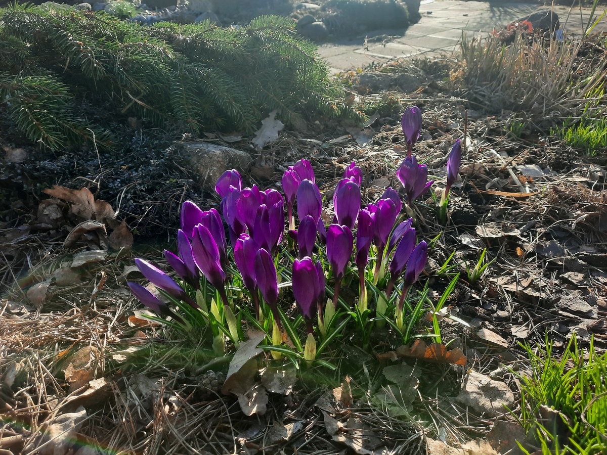 Среди снегов на солнечных лужайках зацветают крокусы. Эта куртина е самая ранняя, зато красивая. Старалась выбирать, что глаз порадует в серости самого темного месяца года. Крокусы люблю, стараюсь постоянно увеличивать их количество и разнообразие. Так что яркие пятна их куртинок притягивают взгляды по всему саду.
