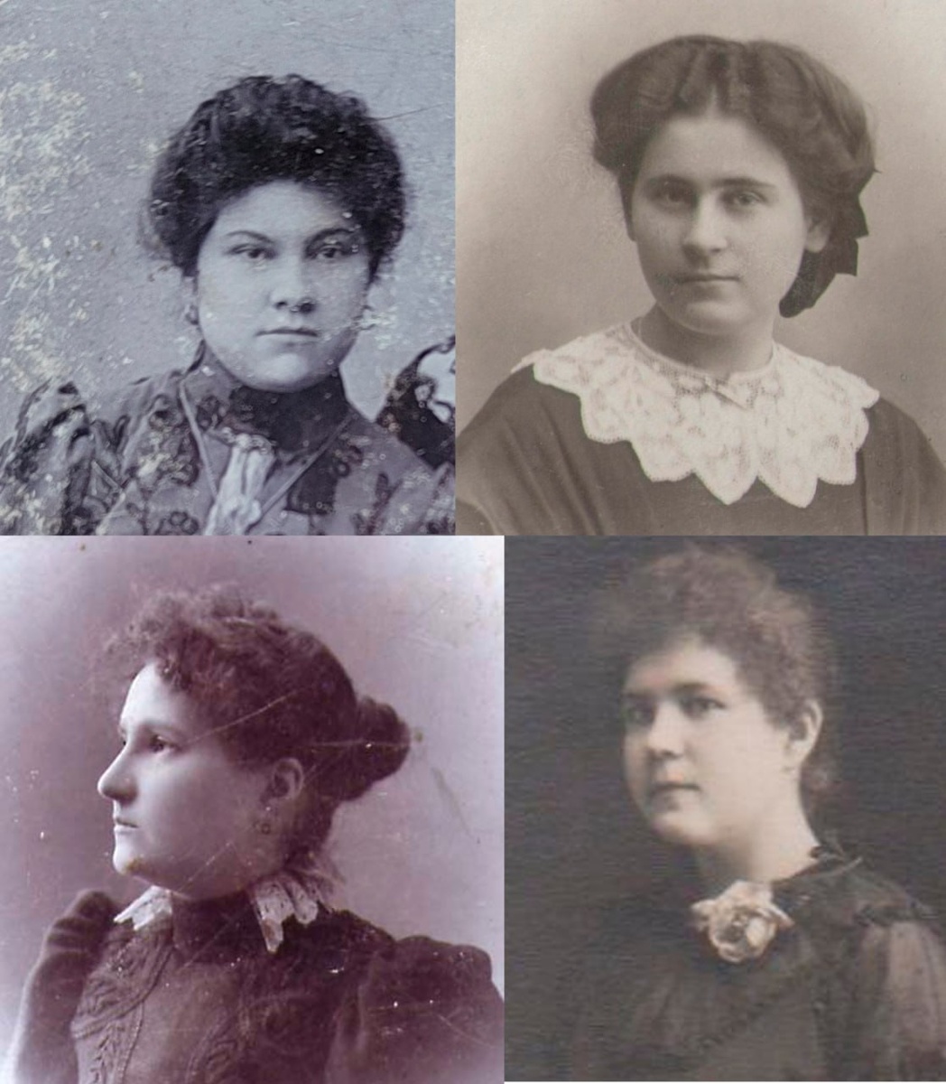 Есть фотография советского периода какой-то бабушки, предположительно из Туркиных. И мы её сравниваем со всеми фотографиями начала ХХ века, кем она могла бы быть в молодости. И, что удивительно, бабушка на всех похожа. Сначала было непонятно - ну как так-то? А сейчас сделала коллаж и они действительно все какие-то одинаковые. Это - разные девушки. верхние между собой - троюродные сестры. Нижняя левая - тётя нижней правой. Больше никак не связаны. Кажется, фотограф Аронс всех ретушировал до потери узнаваемости 😄