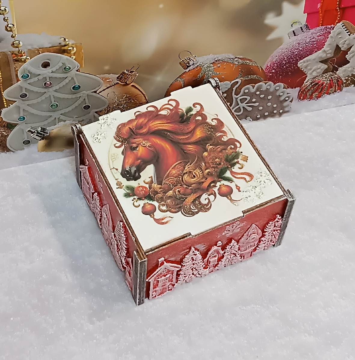 Надеюсь, вы не устали от обилия лошадок в лентах))), но присутствие этого персонажа неизбежно на большинстве декорируемых предметах и новогодних сувенирах. Поэтому движемся рысцой дальше! И сегодня я предлагаю вариант украшения деревянной коробочки, преобразованной в новогоднюю шкатулку. Главным мотивом здесь станет Огненная Лошадь, символ 2026 года. Используемые в работе техники -декупаж и декор лепными элементами. Материалы: деревянная заготовка шкатулки, распечатка картинки - два размера (на крышку и на медальон), акриловые краски - белая и красная, акриловый лак, морилка, клей ПВА и Момент прозрачный, шпатлевка по дереву, древесная паста, молды и трафарет, наждачная бумага, кисти, шпатель, декоративный глиттер, нить бусин. Итак, в качестве основы я взяла деревянную коробочку, бывшую в прошлом упаковкой: Для начала затонировала морилкой внутреннюю часть и накладки на углах: углы дно внутренняя часть Далее нужно обработать крышку, где присутствует ажурная надпись. Ее затираю шпатле