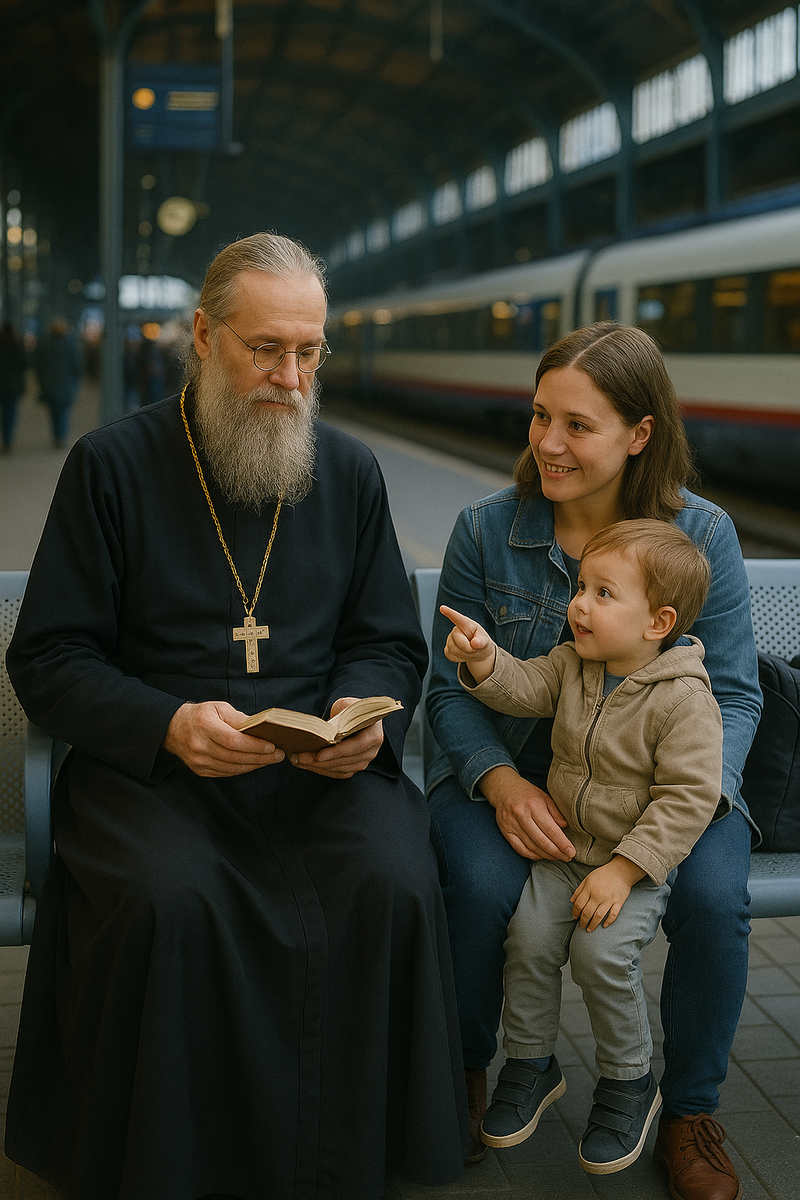 “Стояли с ребёнком на вокзале, ждали электричку. Ребёнку тогда было 6 лет. Рядом с нами сидел батюшка, такой здоровый - 2 метра ростом, 1,5 метра в обхвате, седая борода до груди и огромный крест на шее.