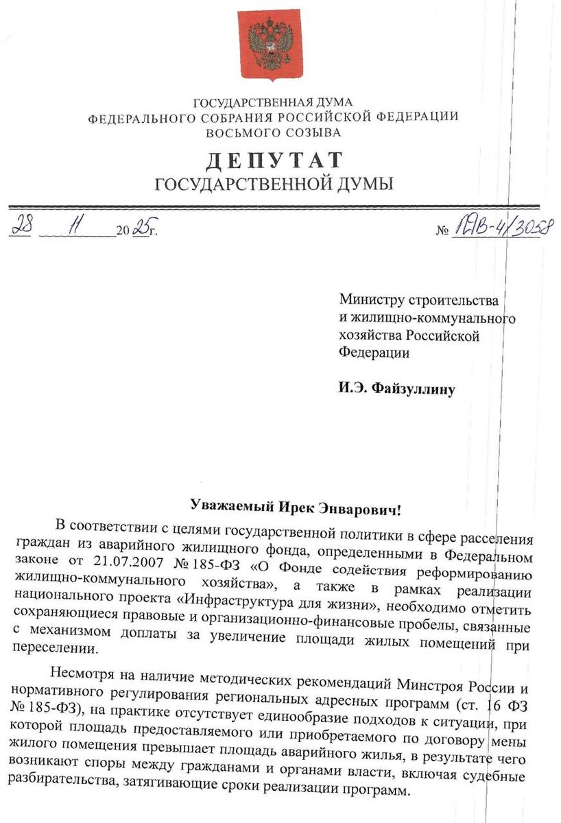 ❗️Переселение без доплаты 📩 Обратилась к министру строительства и ЖКХ РФ Иреку Файзуллину с предложением освободить граждан от обязательной доплаты за увеличение площади жилого помещения до 7 кв. м при переселении из аварийного жилья по официальным региональным программам. ➡️ Установленный порог не создает условий для злоупотреблений, так как ограничен рамками обязательного переселения и учитывает разброс типовых планировок квартир. 🧷Данная мера позволит урегулировать ситуацию, когда новое жилье из-за типовых планировок не совпадает по площади со старым, что приводит к требованиям к гражданам по софинансированию разницы. 📝 Кому-то приходится доплачивать сумму, которой просто у людей нет, что заканчивается спорами и судебными разбирательствами между собственниками и органами власти. Это затягивает сроки реализации программ и переезд. 🔨Региональная практика показывает высокую степень неоднородности: в одних субъектах люди вынуждены производить доплату за каждый избыточный квадрат