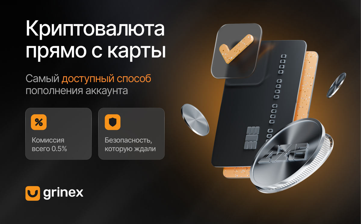 Почему это выгодно Минимальная комиссия – 0,5% Теперь это один из самых выгодных способов покупки криптовалюты на рынке. Мгновенное зачисление Пользователь выбирает сумму, подтверждает оплату - и средства сразу появляются на балансе Grinex. Безопасно Все платежи проходят через проверенные платёжные сервисы. Никаких рисков, связанных с посредниками и P2P. Лимиты до 600 000 ₽ Ограничение устанавливает банк. Действует на один платёж или на суммарный объём операций в месяц.