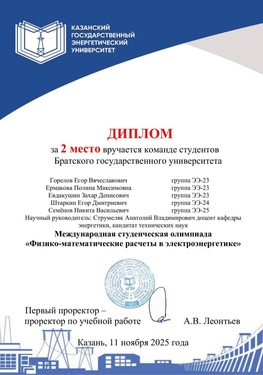 Студенты БрГУ приняли участие в Международной студенческой on-line олимпиаде «Физико-математические расчеты в электроэнергетике», которую провела кафедра «Электроэнергетические системы и сети» Казанского государственного энергетического университета в ноябре. Олимпиада проводится ежегодно, с целью повышения качества подготовки обучающихся, выявления одаренной молодежи и формирование кадрового потенциала электроэнергетической отрасли. Участникам олимпиады были предложены для решения 4 задания по следующим направлениям: ⚡️Дисциплина: «Теоретические основы электротехники», раздел: «Расчет параметров электрической цепи постоянного тока»; ⚡️Дисциплина: «Физика», раздел: «Электричество». ⚡️Дисциплина: «Высшая математика», раздел: «Дифференциальное и интегральное исчисление функции одной переменной». В Олимпиаде приняло участие всего 192 студента, из 6 стран и 17 зарубежных и России университетов! Результаты команд Братского государственного университета: Команда А.В. Стумеляка 🥈 КОМАНДН