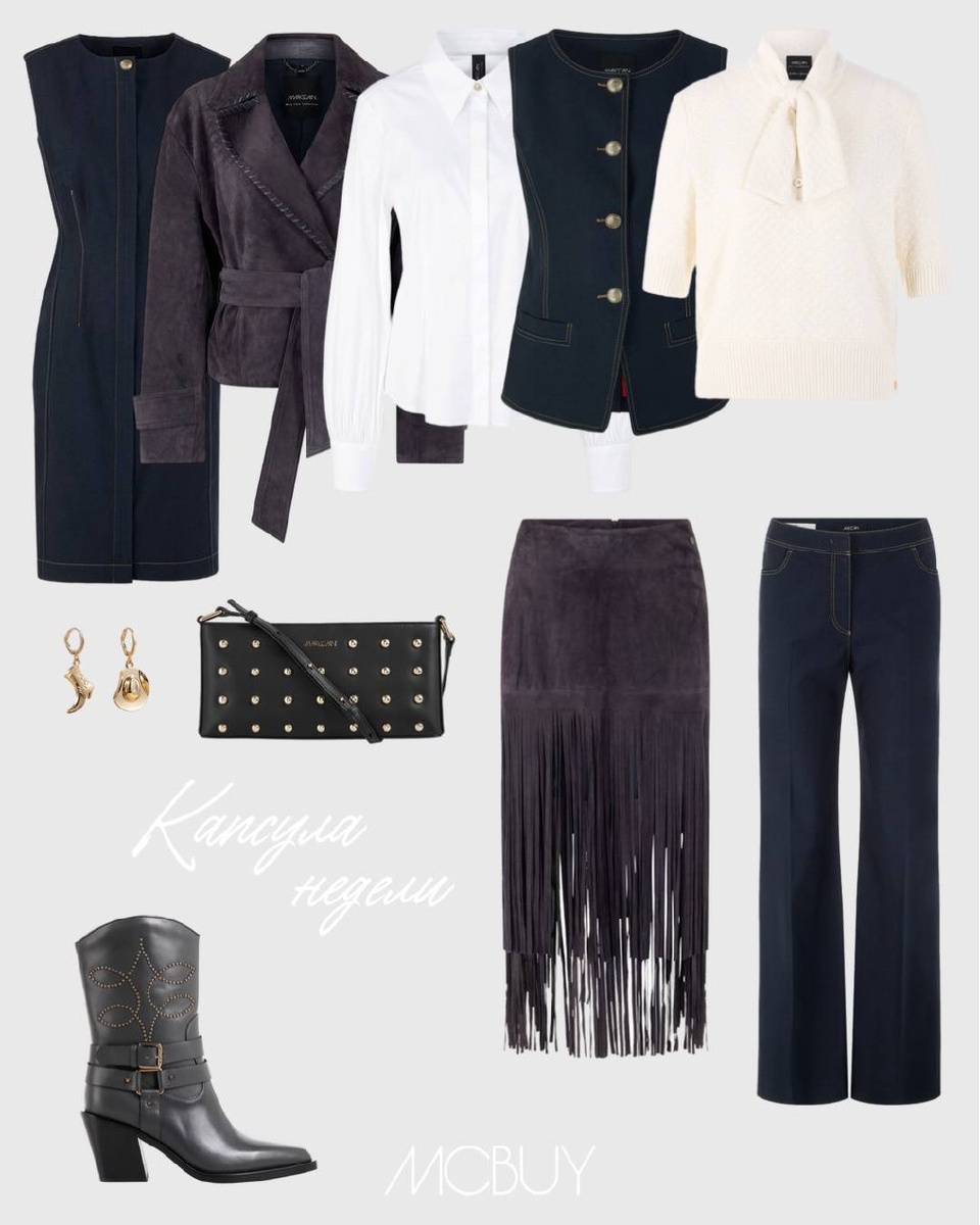 Капсула недели Капсула построена на красивых фактурах — мягкой замше, гладкой коже и практичном хлопке. Баланс создают хлопковые базы: белая рубашка и кремовый джемпер с бантом. Джинсовый жилет, платье и джинсы в тон добавляют строгости и завершённости силуэтам. Главный модный штрих — бахрома. Юбка со струящейся бахромой и замшевая куртка создают современный вестерн-настрой. Кожаные ковбойские сапоги и сумка с заклёпками усиливают эффект. Новинки доступны на сайте, а также в бутиках Москвы и Санкт-Петербурга.