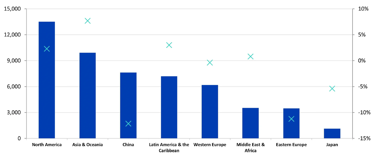 За III кв. 2025 г., как подсчитали в Omdia, в мире было отгружено 52,5 млн телеприёмников, — на 0,6% меньше, чем за аналогичный период в прошлом году. Сильнее всего подпортил статистику материковый Китай, причём дважды. Во-первых, как раз на протяжении 2024 г. в КНР действовала широкая правительственная программа субсидирования покупок производимой в стране сложной бытовой техники — и это ощутимо (на мировом уровне) стимулировало поставки ТВ в канал продаж, задав вместе с тем высокую базу для последующих сравнений. Во-вторых, в отчётный период уже текущего года программа эта не действовала, и плюс к тому в её рамках огромное количество китайских покупателей успели закрыть свои потребности в больших домашних экранах (которых, в отличие от смартфонов, на типичное домохозяйство редко приходится больше одного). Поставки ТВ в канал продаж по регионам мира за III кв. 2025 г., столбцы, тыс. единиц, и соответствующие значения годовой динамики, крестики, %, правая шкала Источник: Omdia Сниже