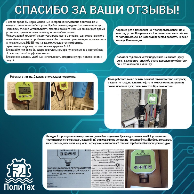 Давненько тут не было отзывов о нас... пожалуйста! Отзывы представлены на наши популярные товары на Озоне. Читайте, покупайте, а если у вас остались вопросы или нужна помощь в подборе, то звоните по бесплатному телефону по России 8-800-500-45-69 или пишите на почту op@pumpcontroller.ru поможем, подскажем!
