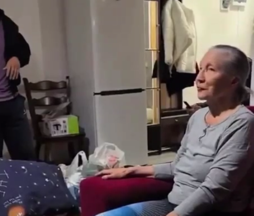 На фотографии запечатлена пожилая женщина, которая, судя по обстановке, находится в обычной городской квартире, вероятно, в той самой, о которой идет речь. У нее короткая стрижка, она одета в простую серую кофту с пуговицами на вороте. Женщина сидит на диване или кресле, опираясь рукой на подлокотник. Ее лицо выглядит спокойным и решительным, она смотрит в сторону с выражением, которое можно истолковать как уверенность в своей правоте. В интерьере заметны бытовые предметы, включая упакованные пакеты на заднем плане и одежду, висящую на вешалке.