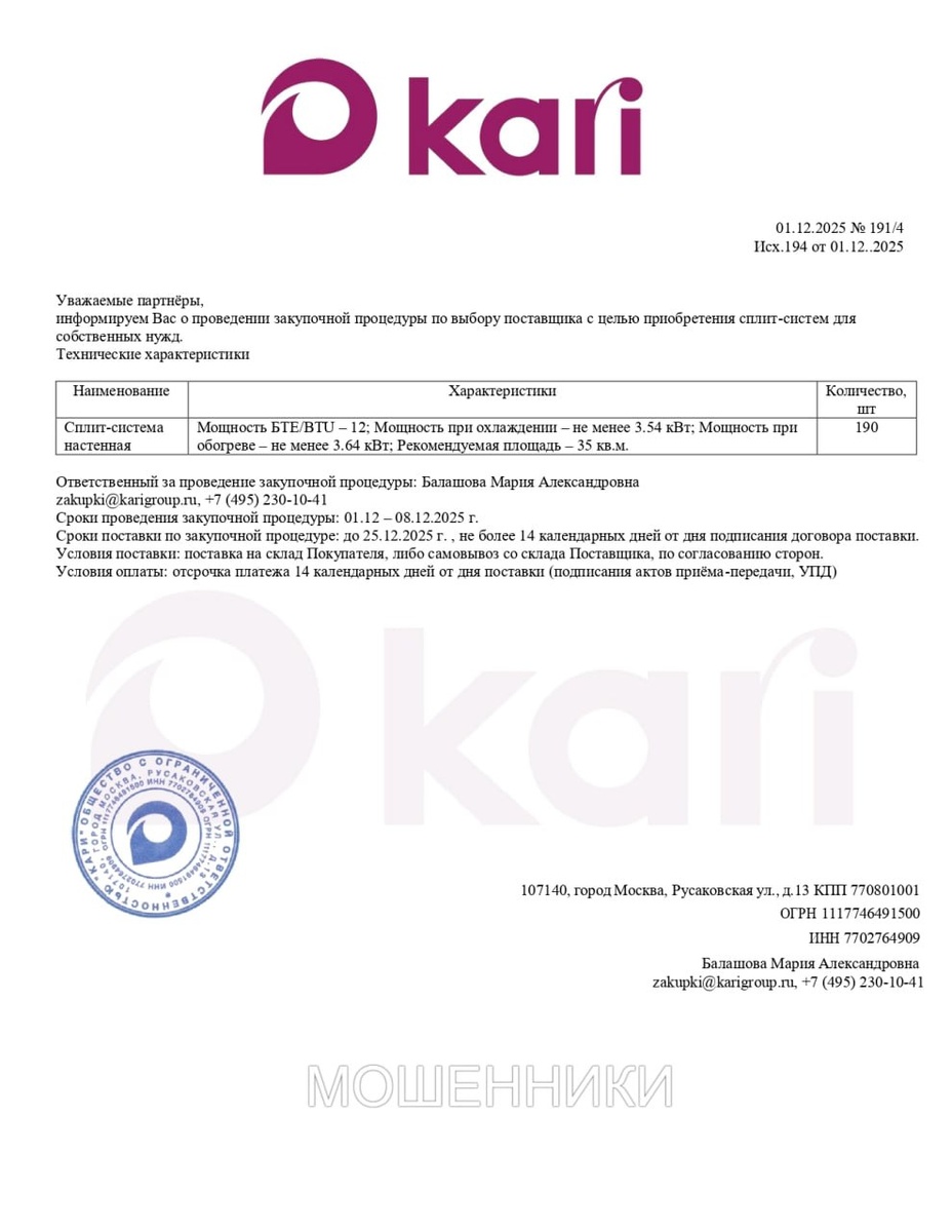 ⚠️ ВНИМАНИЕ, МОШЕННИКИ! Остерегайтесь "выгодных" заказов! 🚨 01.12.2025 к нам в компанию PLOTOV GROUP поступило новое мошенническое предложение под видом срочной закупки от компании ООО "Кари". Всё выглядит очень убедительно: официальные реквизиты, детальное техническое задание на 190 сплит-систем, контактное лицо Мария Балашова. Но это ЛОВУШКА. 🕳💸 Вот главные красные флаги, которые выдают аферистов: 1️⃣ 📄 Поддельные документы. Мошенники активно используют сканы якобы официальных документов и даже формируют PDF-файлы, чтобы придать сделке видимость легальности. Всё это — липа. 2️⃣ 🚚 Условие "самовывоз". Вам предлагают "самовывоз со склада Поставщика по согласованию сторон". На практике это означает, что после вашего согласия вас направят на несуществующий или контролируемый мошенниками "склад", где с вас потребуют предоплату за "резерв" товара или услуги грузчиков/экспедиторов. После оплаты контакты обрываются. 3️⃣ 💳 Слишком выгодные условия оплаты. Отсрочка 14 дней для нового