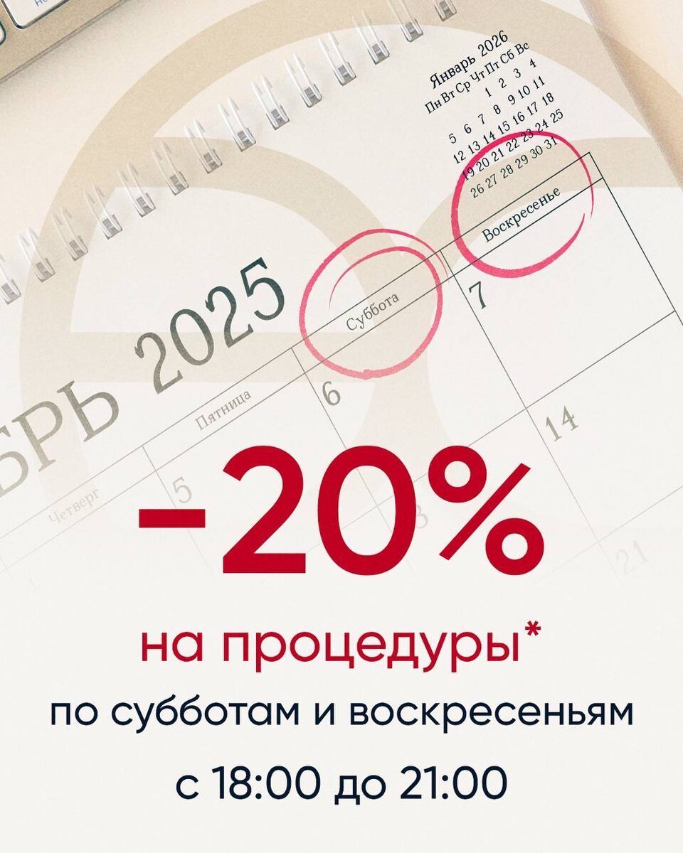 -20% на процедуры по субботам и воскресеньям! 1-30 декабря каждую субботу и воскресенье -20% на процедуры с 18:00 до 21:00. Ждём вас в клинике Эстелаб🫶