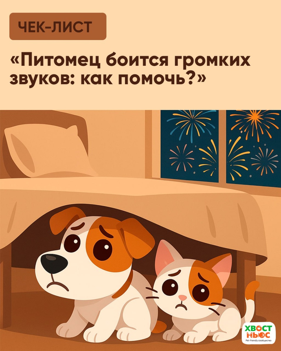 Сезон салютов приближается, и для многих питомцев это время тревоги. Чтобы помочь им во время громких праздников, мы подготовили бесплатный чек-лист «Питомец боится громких звуков: как помочь?». Внутри - признаки шумофобии у собак и кошек, что делать во время звукового стресса и как заранее подготовиться к этому периоду. Получить бесплатный чек лист по ссылке: https://vk.com/app7070938_-118845332#s=692da7bf34fb3c116f47b4a9