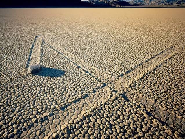 Камни из Долины смерти. Вы куда? Геологический феномен, обнаруженный на высохшем озере Рейстрэк-Плайя в Долине Смерти в США. Камни медленно двигаются по глинистому дну озера, оставляя за собой длинные борозды. И ладно бы ветром надуло, зверята или люди подтолкнули, но нет. Самые разные камни весом от полукилограмма до нескольких сот (!) кг тихонько «ползут» без посторонней помощи. Ну понятно, что до ХХ века дичуньку объясняли вмешательством высших сил. Потом наука поднажала, и стали выдвигать самые разные версии загадочного движения. В 1970-е все настолько запутались, что подготовили программу слежения за передвижениями камней. Забавно, что до 2013 года зафиксировать на камеру их движуху никто не додумался (ну или это было слишком дорого с учётом того, что движутся камни примерно раз в пару лет со скоростью несколько десятков метров в год 🙃). В итоге всякие геологи поназащищали диссертаций по этой теме и, наконец, разгадали тайну. Причиной движения были обширные, но очень тонкие пла