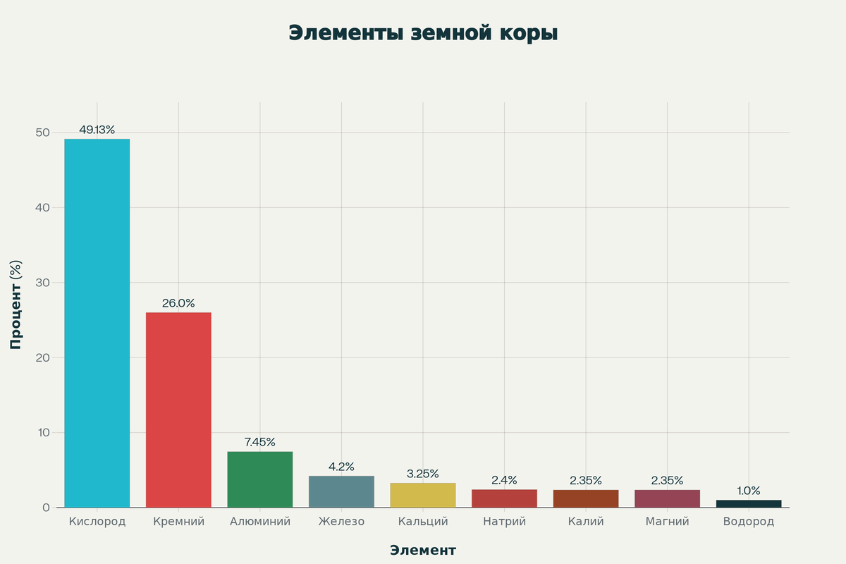 Когда мы говорим о составе земной коры, нужно помнить, что это не просто смесь элементов в чистом виде. Все элементы находятся в виде химических соединений - они образуют молекулы и сложные структуры, из которых состоят минералы и горные породы. Но если считать массу всех атомов, содержащихся в земной коре, то нетрудно вычислить, сколько процентов приходится на каждый элемент.wikipedia+1