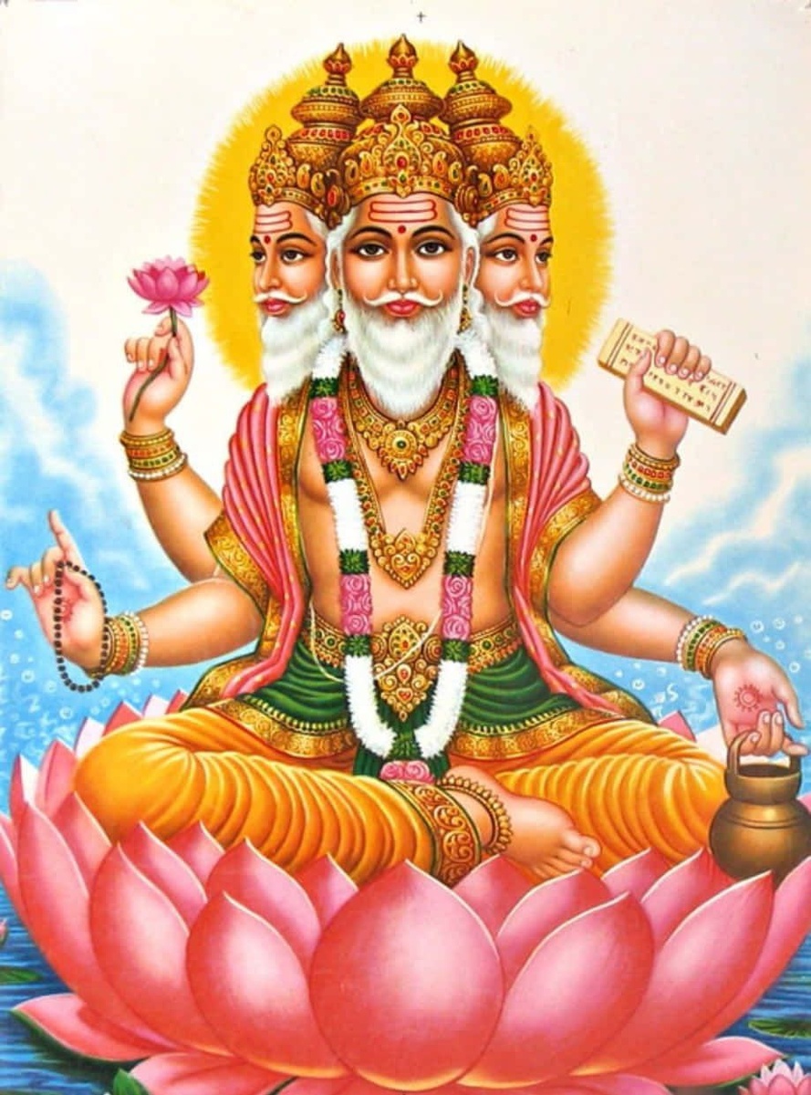 · Внешность: Четыре лица, четыре руки, борода, сидит на лотосе