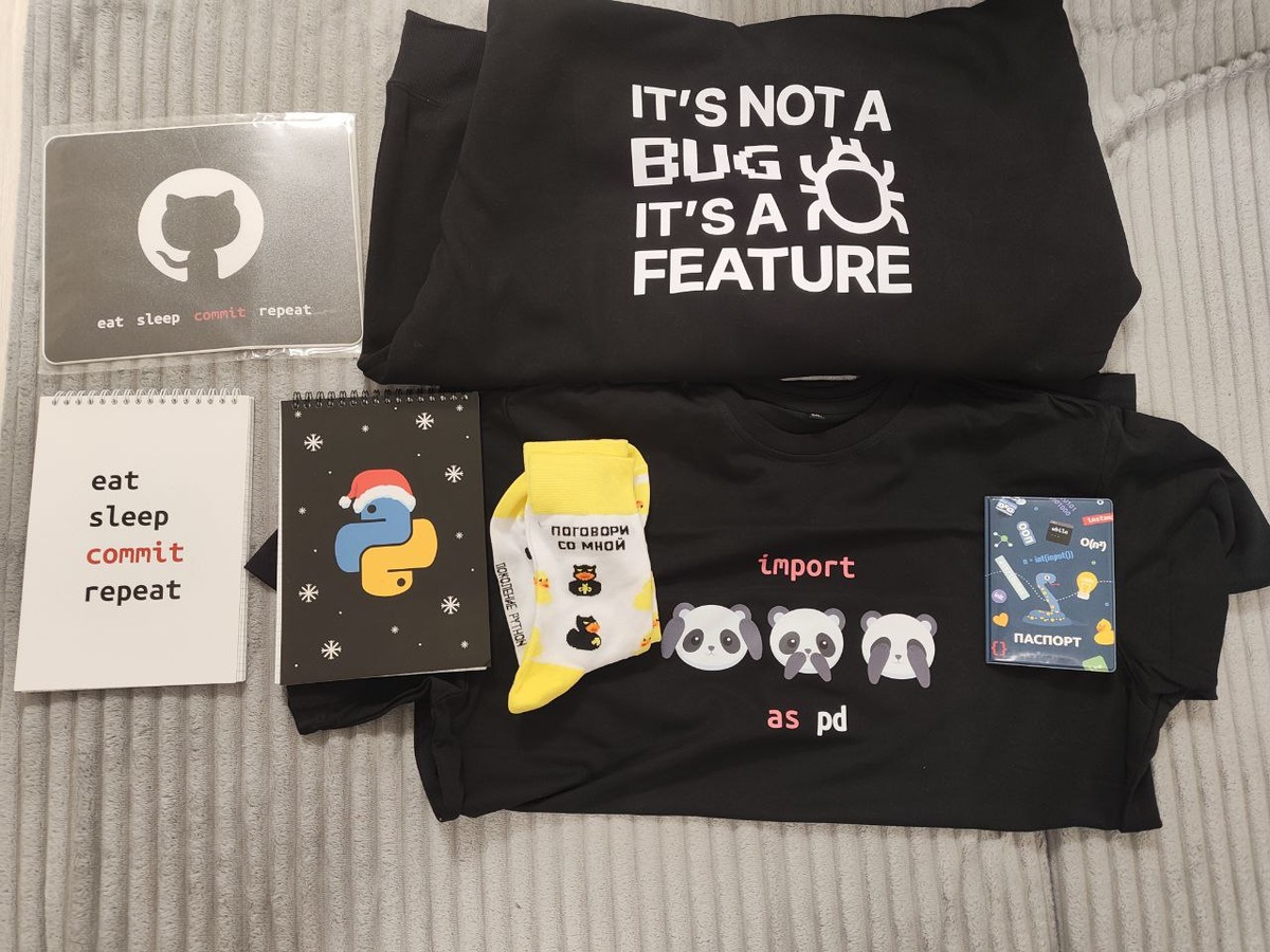 Вообще, я заказывал у @pygen_ru только худи "Это не баг, а фича" и футболку с пандами. Но мне тут к заказу ещё нагрузили: обложку для паспорта, два блокнота, небольшой коврик для мыши и носки.