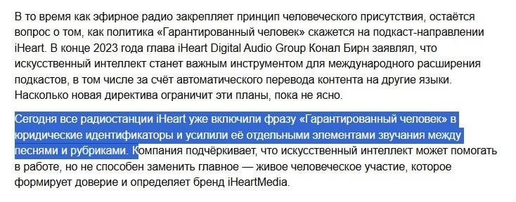 iHeartMedia первой в США вводит строгую политику против ИИ в радиоэфире - передаёт Onair. Опять поперёк горла так называемым РАР, которые даже не успели придумать, как на AI наварить бабла - и побежали за более выгодным предательством, "продав" сообщество грабителям из фейковых ЖОПУИПов. Клиническим неудачникам из ГПМХ, правда, тоже досталось - плакал их бизнес по рейдерскому захвату каталогов контента, созданных пользователям Suno AI - в этом году у них "навернулись" основные проекты - Yappy со всеми лейблами, горит огнём и одновременно тонет в продуктах своей жизнедеятельсности проект по разводняку пустоголовых блогеров Insight People Проникшие во власть дилетанты думали, что счас они тут и там, заменят людей на ИИ. Но, у прогресса свои правила - заменят скорее их самих. iHeartMedia стала первой крупной радиогруппой, которая официально запретила использование голосов и контента, созданных ИИ, в своём эфире. Новая политика, представленная как кампания «Гарантированный человек», по