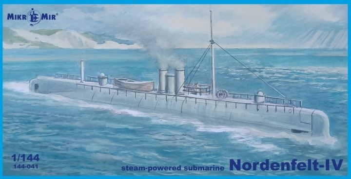 MikroMir из Днепропетровска выпустила ЛНД-модель шведской паровой подводной лодки 1887 года Nordenfelt IV (ее пытались продать России, но не доплыла) в масштабе 1/144: Nordenfelt IV Steam-powered submarine (каталожный номер 144-041)