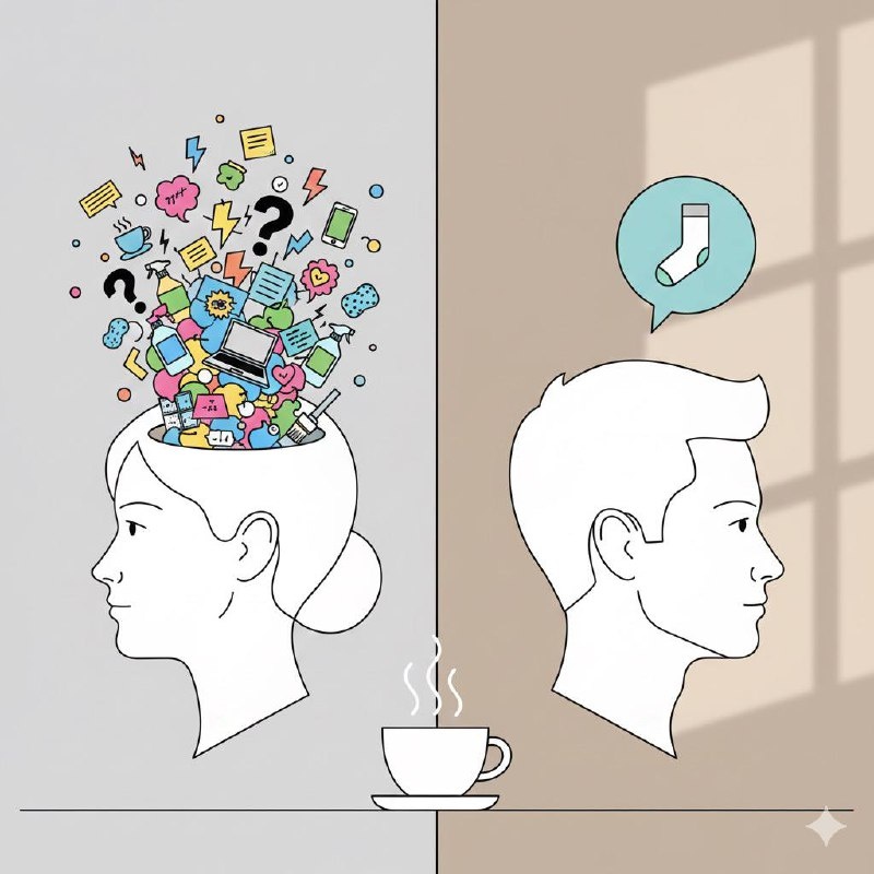 Муж смотрит на меня с кружкой кофе: “О чем думаешь?” А я в этот момент думаю о ТОМ, ЧТО: • Надо обновить лицензии на статистический софт для всей команды (дедлайн когда вообще?) • Несколько лет назад мне предлагали позицию на мясокомбинате. Интересно, как бы сложилось… • Кофемашина требует чистки, там уже тартараж назревает • Почему стена дома напротив такая уродская? Неужели нельзя было фасад нормально сделать? • И КСТАТИ — надо в Икею, купить мужу держатель для кружки, а то он рано или поздно прольет кофе на ноутбук Все это — одновременно. Рой мыслей. Хаос. 125 вкладок браузера открыто. И тут я пытаюсь выбрать, какую из этих мыслей озвучить… Начинаю перечислять. А муж слушает и говорит: — У меня все проще. Вот сейчас я думал: “Надо ..надеть …носок”. Всё…. Одна. Мысль. За раз. Девочки, у вас тоже 125 мыслей в секунду? Мальчики, вы правда так устроены — по одной мысли в момент времени? КАК это вообще возможно? Научите! 😅
