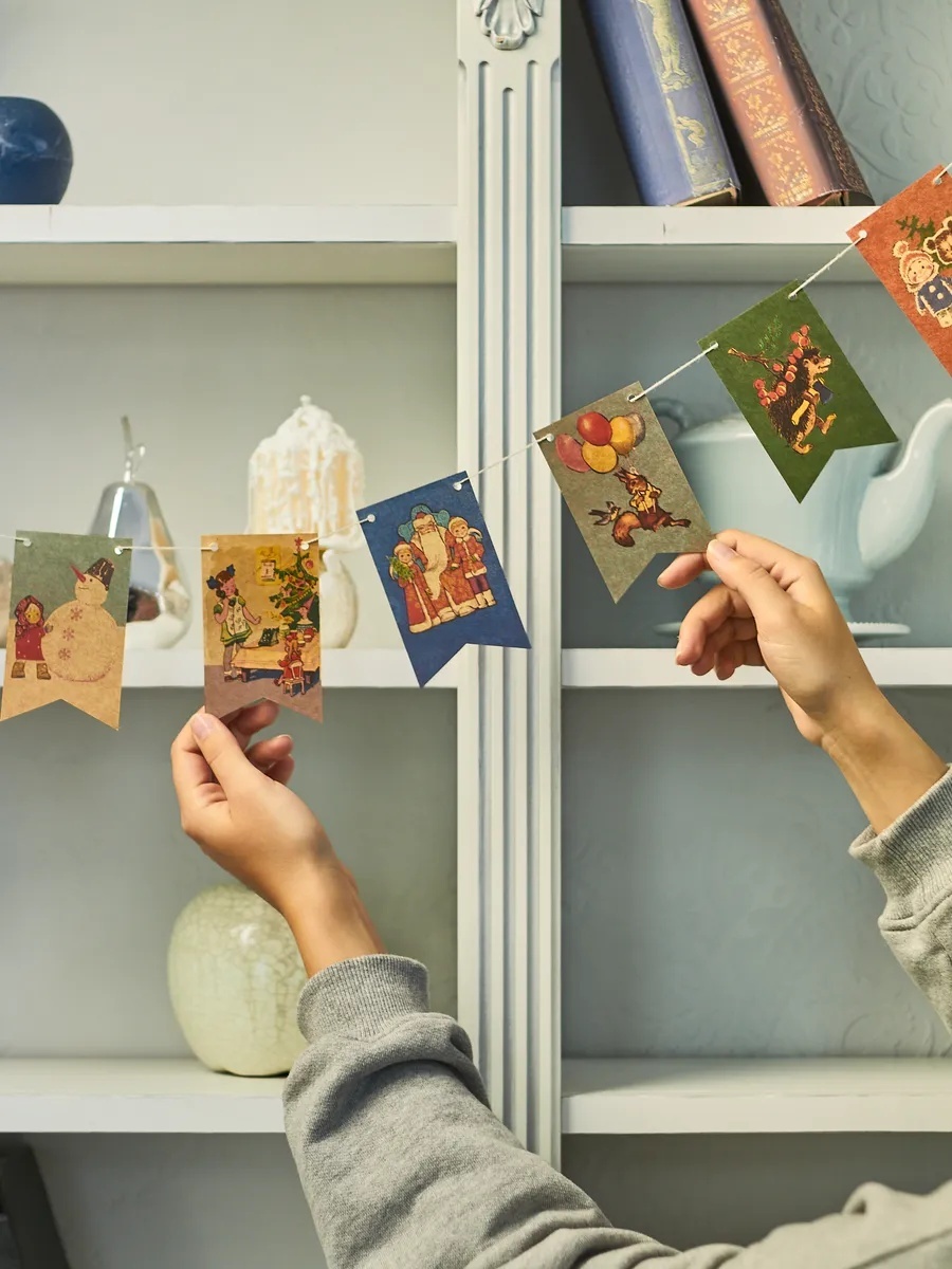 Эти гирлянды из флажков — самый прямой билет в новогоднее детство наших родителей, а может, и наше собственное. Яркие, с узнаваемыми советскими сюжетами, домиками, снеговиками и надписями «С Новым годом!», они не просто украшают пространство, а создают настроение. Их можно растянуть над окном, вдоль стены, над дверным проёмом или даже на самой ёлке вместо привычной мишуры.