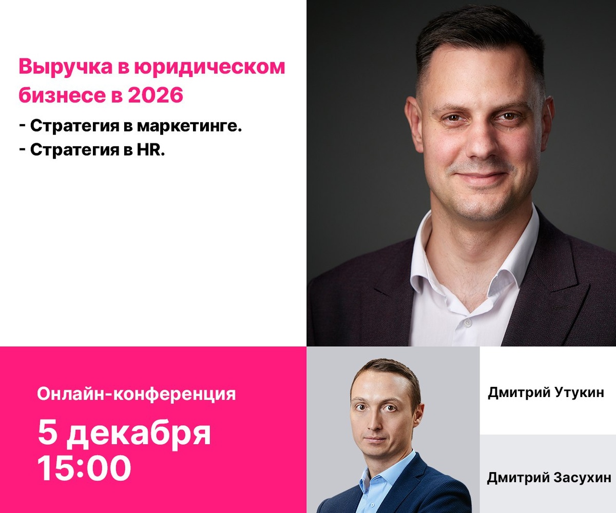 Коллеги, напоминаю! Приглашаем вас 5 декабря на онлайн конференцию! На конференции мы разберем стратегию получения выручки в юридическом бизнесе в разрезе маркетинга и HR. Я буду рассказывать о стратегии получения клиентов, а Дмитрий Утукин о стратегии найма юристов, которые будут отрабатывать контракты. Вступайте в эту группу, там будет направлена ссылка на учаcтие в конференции. Участие бесплатное. Ссылка на вступление: https://t.me/+8ewf9x41vWplNTIy